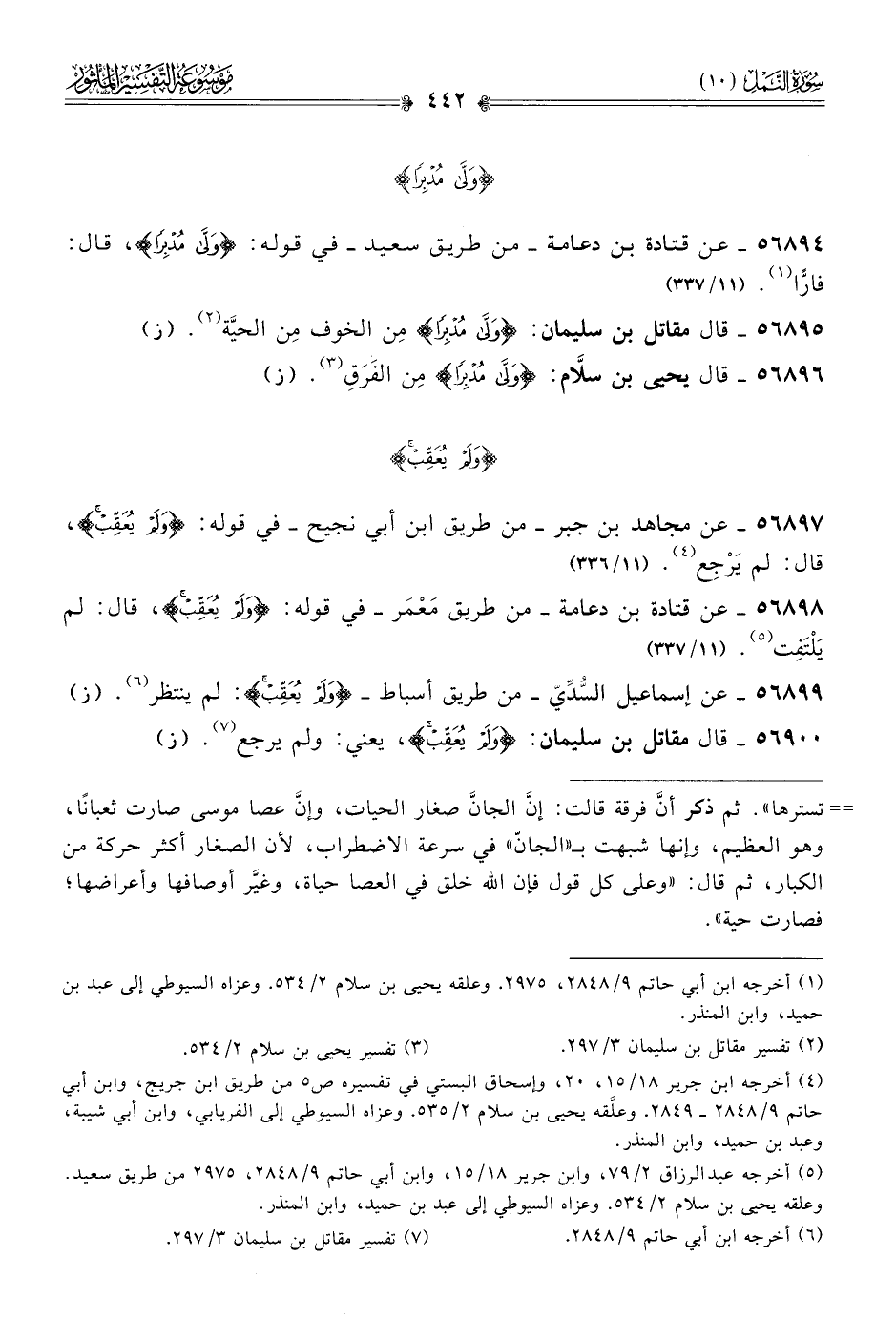 ٥٦٨٩٤ - عن قتادة بن دعامة -من طريق سعيد- في قوله: {ولى مدبرا}، قال: فارًّا (¬١). (١١/ ٣٣٧)