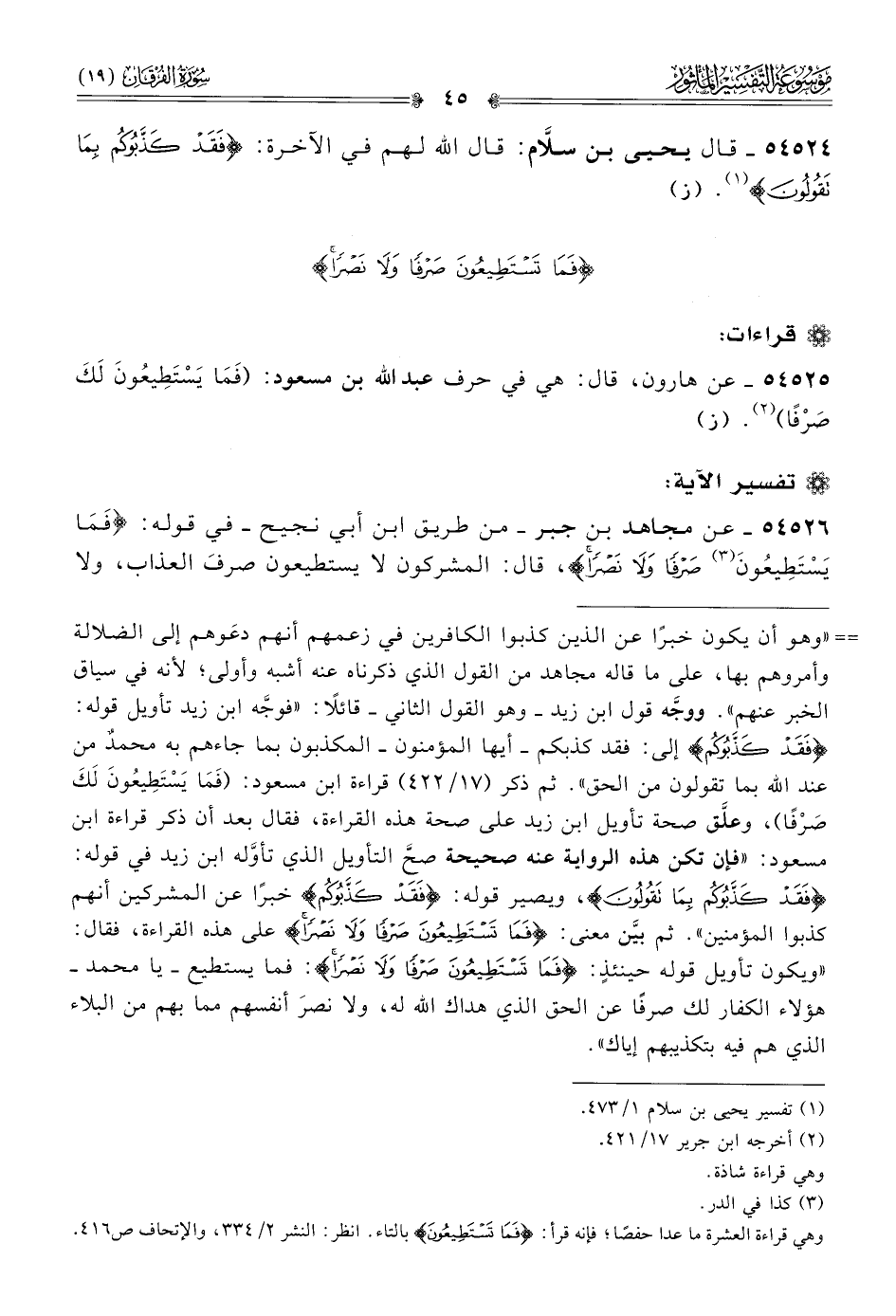 ٥٤٥٢٦ - عن مجاهد بن جبر -من طريق ابن أبي نجيح- في قوله: «فَما يَسْتَطِيعُونَ (¬٣) صَرْفًا ولا نَصْرًا»، قال: المشركون لا يستطيعون صرفَ العذاب، ولا