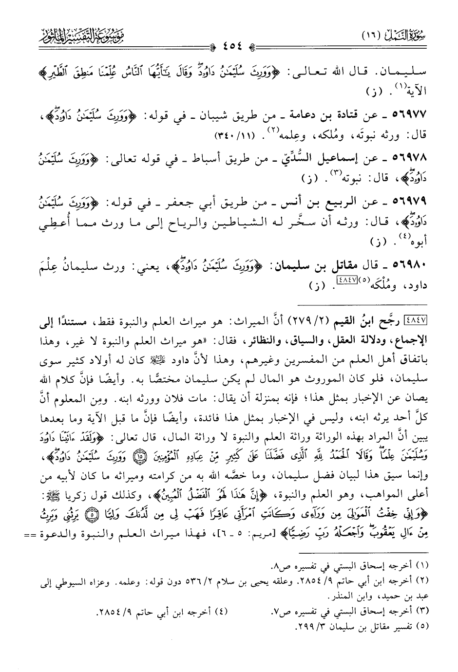 [٤٨٤٧] رجَّح ابنُ القيم (٢/ ٢٧٩) أنّ الميراث: هو ميراث العلم والنبوة فقط، مستندًا إلى الإجماع، ودلالة العقل، والسياق، والنظائر، فقال: «هو ميراث العلم والنبوة لا غير، وهذا باتفاق أهل العلم من المفسرين وغيرهم، وهذا لأنّ داود - عليه السلام - كان له أولاد كثير سوى سليمان، فلو كان الموروث هو المال لم يكن سليمان مختصًّا به. وأيضًا فإنّ كلام الله يصان عن الإخبار بمثل هذا؛ فإنه بمنزلة أن يقال: مات فلان وورثه ابنه. ومِن المعلوم أنّ كلَّ أحد يرثه ابنه، وليس في الإخبار بمثل هذا فائدة، وأيضًا فإنّ ما قبل الآية وما بعدها يبين أنّ المراد بهذه الوراثة وراثة العلم والنبوة لا وراثة المال، قال تعالى: {ولقد آتينا داوود وسليمان علما وقالا الحمد لله الذي فضلنا على كثير من عباده المؤمنين وورث سليمان داوود}، وإنما سيق هذا لبيان فضل سليمان، وما خصَّه الله به من كرامته وميراثه ما كان لأبيه من أعلى المواهب، وهو العلم والنبوة، {إن هذا لهو الفضل المبين}، وكذلك قول زكريا - صلى الله عليه وسلم -: {وإني خفت الموالي من ورائي وكانت امرأتي عاقرا فهب لي من لدنك وليا يرثني ويرث من آل يعقوب واجعله رب رضيا} [مريم: ٥ - ٦]، فهذا ميراث العلم والنبوة والدعوة الى الله، وإلا فلا يظن بنبي كريم أنه يخاف عصبته أن يرثوه ماله، فيسأل الله العظيم ولدًا يمنعهم ميراثه، ويكون أحق به منهم! وقد نزه الله أنبياءه ورسله عن هذا وأمثاله».