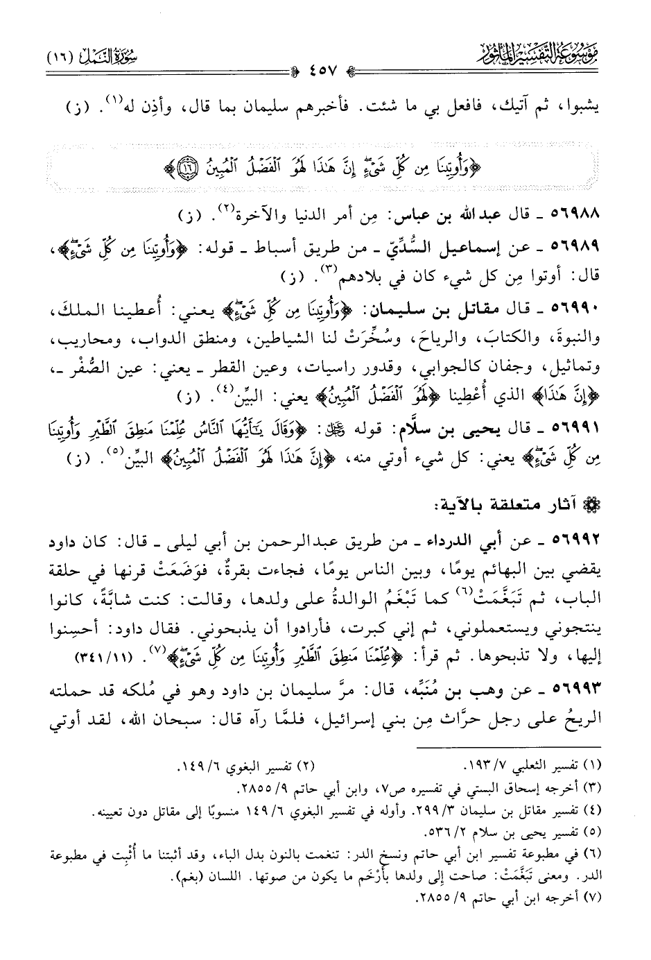 ٥٦٩٩٢ - عن أبي الدرداء -من طريق عبد الرحمن بن أبي ليلى- قال: كان داود يقضي بين البهائم يومًا، وبين الناس يومًا، فجاءت بقرةٌ، فوَضَعَتْ قرنها في حلقة الباب، ثم تَبَغَّمَتْ (¬٦) كما تَبْغَمُ الوالدةُ على ولدها، وقالت: كنت شابَّةً، كانوا ينتجوني ويستعملوني، ثم إني كبرت، فأرادوا أن يذبحوني. فقال داود: أحسِنوا إليها، ولا تذبحوها. ثم قرأ: {علمنا منطق الطير وأوتينا من كل شيء} (¬٧). (١١/ ٣٤١)