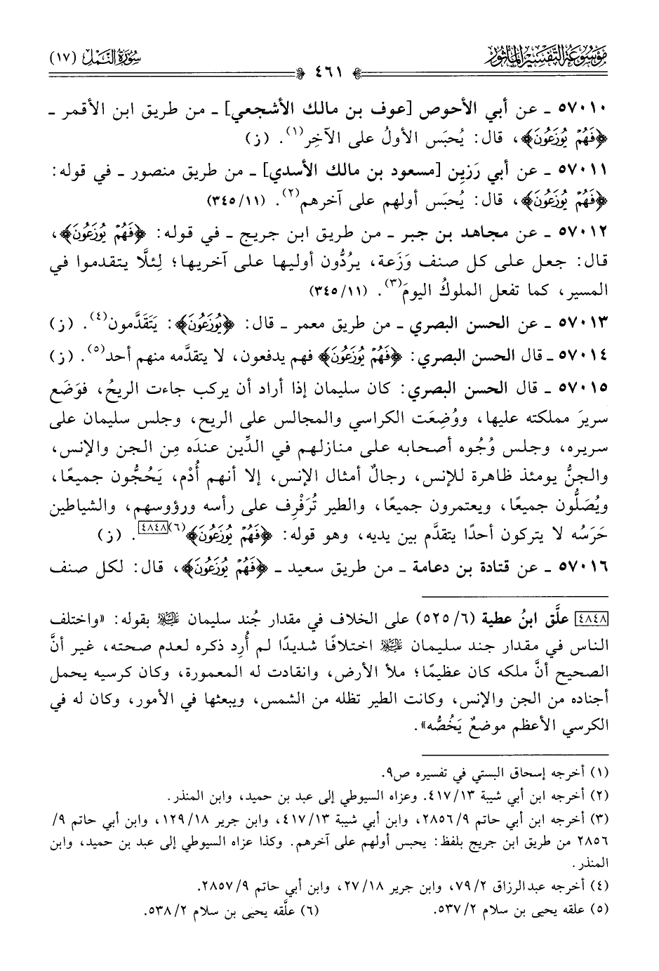 [٤٨٤٨] علَّق ابنُ عطية (٦/ ٥٢٥) على الخلاف في مقدار جُند سليمان - عليه السلام - بقوله: «واختلف الناس في مقدار جند سليمان - عليه السلام - اختلافًا شديدًا لم أُرِد ذكره لعدم صحته، غير أنّ الصحيح أنّ ملكه كان عظيمًا؛ ملأ الأرض، وانقادت له المعمورة، وكان كرسيه يحمل أجناده من الجن والإنس، وكانت الطير تظله من الشمس، ويبعثها في الأمور، وكان له في الكرسي الأعظم موضعٌ يَخُصُّه».