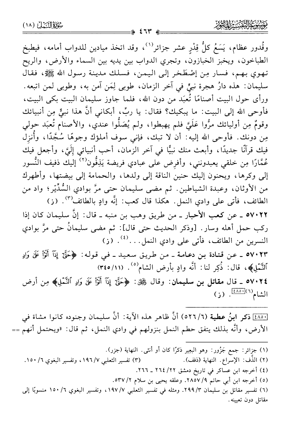 ٥٧٠٢٢ - عن كعب الأحبار -من طريق وهب بن منبه- قال: إنّ سليمان كان إذا ركب حمل أهله وسار. [وذكر الحديث حتى قال]: ثم مضى سليمانُ حتى مرَّ بوادي النسرين من الطائف، فأتى على وادي النمل ... (¬٤). (ز)