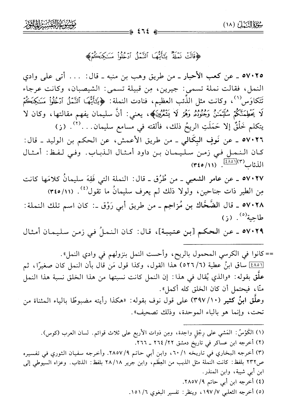 ٥٧٠٢٧ - عن عامر الشعبي -من طُرُق- قال: النملة التي فَقِهَ سليمانُ كلامَها كانت مِن الطير ذات جناحين، ولولا ذلك لم يعرف سليمانُ ما تقول (¬٤). (١١/ ٣٤٥)