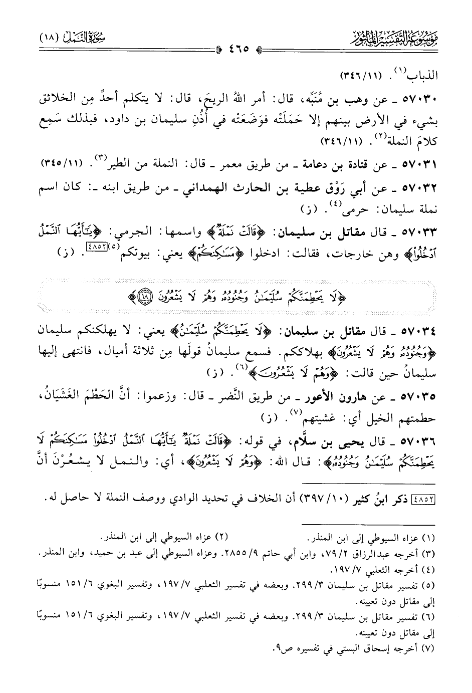 ٥٧٠٣٦ - قال يحيى بن سلّام، في قوله: {قالت نملة يأيها النمل ادخلوا مساكنكم لا يحطمنكم سليمان وجنوده}: قال الله: {وهم لا يشعرون}، أي: والنمل لا يشعُرْنَ أنّ