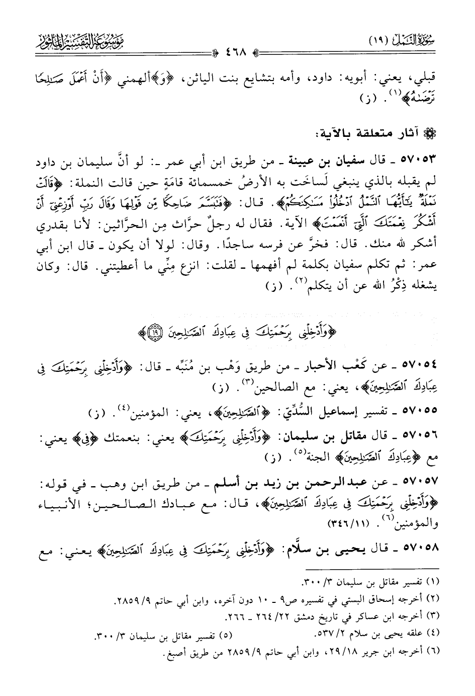 ٥٧٠٥٧ - عن عبد الرحمن بن زيد بن أسلم -من طريق ابن وهب- في قوله: {وأدخلني برحمتك في عبادك الصالحين}، قال: مع عبادك الصالحين؛ الأنبياء والمؤمنين (¬٦). (١١/ ٣٤٦)