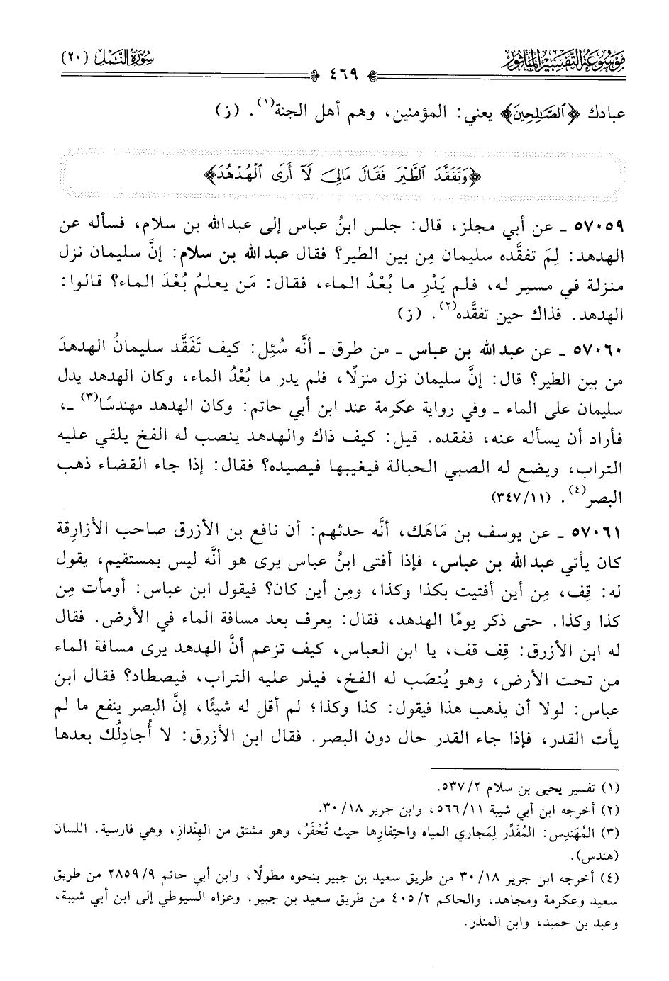 ٥٧٠٥٩ - عن أبي مجلز، قال: جلس ابنُ عباس إلى عبد الله بن سلام، فسأله عن الهدهد: لِمَ تفقَّده سليمان مِن بين الطير؟ فقال عبد الله بن سلام: إنّ سليمان نزل منزلة في مسير له، فلم يَدْرِ ما بُعْدُ الماء، فقال: مَن يعلمُ بُعْدَ الماء؟ قالوا: الهدهد. فذاك حين تفقَّده (¬٢). (ز)