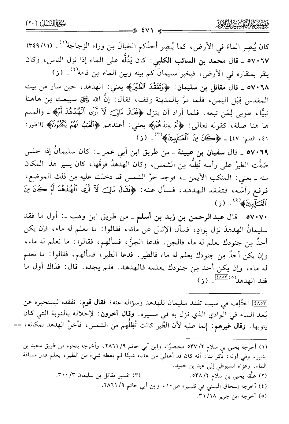 ٥٧٠٧٠ - قال عبد الرحمن بن زيد بن أسلم -من طريق ابن وهب-: أول ما فقد سليمانُ الهدهدَ نزل بِوادٍ، فسأل الإنسَ عن مائه، فقالوا: ما نعلم له ماء، فإن يكن أحدٌ مِن جنودك يعلم له ماء فالجن. فدعا الجنَّ، فسألهم، فقالوا: ما نعلم له ماء، وإن يكن أحدٌ مِن جنودك يعلم له ماء فالطير. فدعا الطير، فسألهم، فقالوا: ما نعلم له ماء، وإن يكن أحد مِن جنودك يعلمه فالهدهد. فلم يجده. قال: فذاك أول ما فقد الهدهد (¬٥) [٤٨٥٣]. (ز)