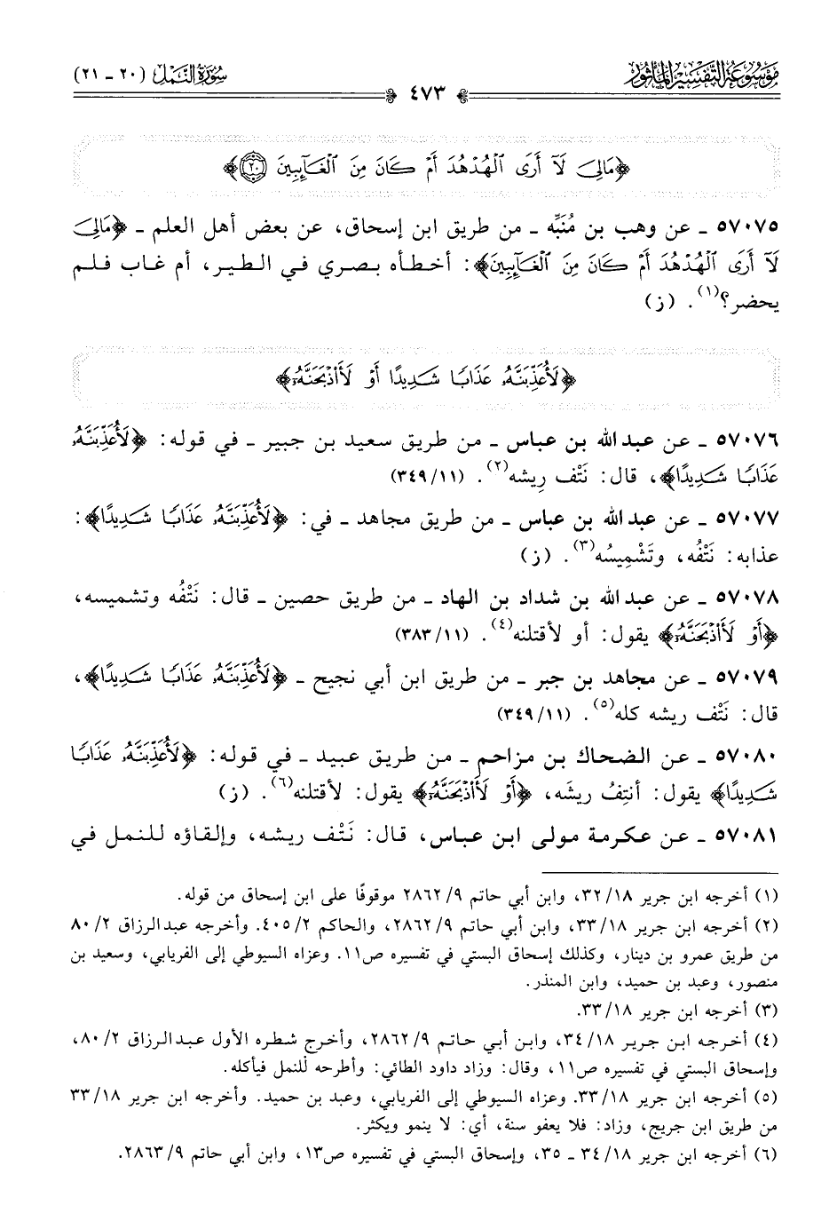 ٥٧٠٨٠ - عن الضحاك بن مزاحم -من طريق عبيد- في قوله: {لأعذبنه عذابا شديدا} يقول: أنتِفُ ريشَه، {أو لأذبحنه} يقول: لأقتلنه (¬٦). (ز)
