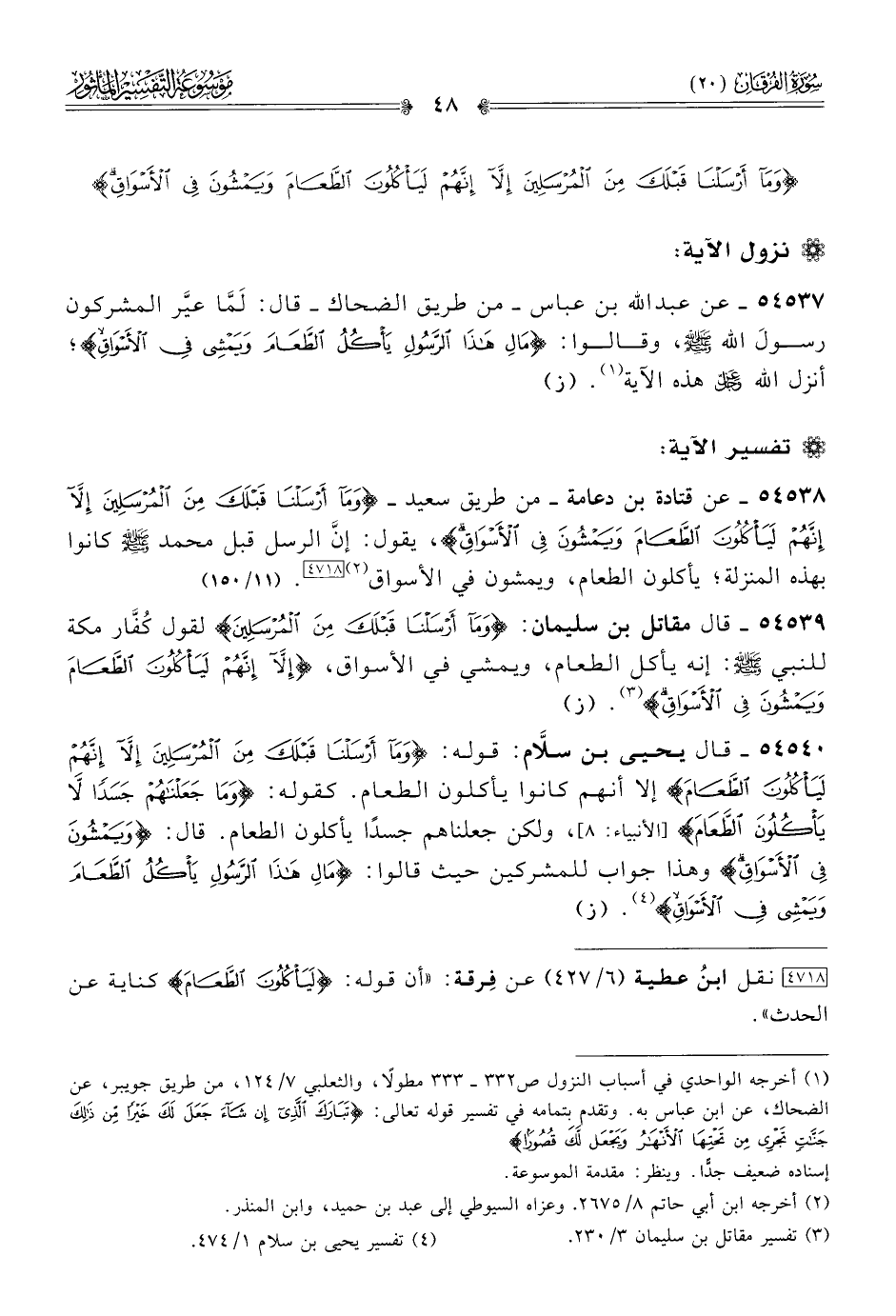 ٥٤٥٣٧ - عن عبد الله بن عباس -من طريق الضحاك- قال: لَمّا عيَّر المشركون رسولَ الله - صلى الله عليه وسلم -، وقالوا: {ما لهذا الرسول يأكل الطعام ويمشي في الأسواق}؛ أنزل الله - عز وجل - هذه الآية (¬١). (ز)