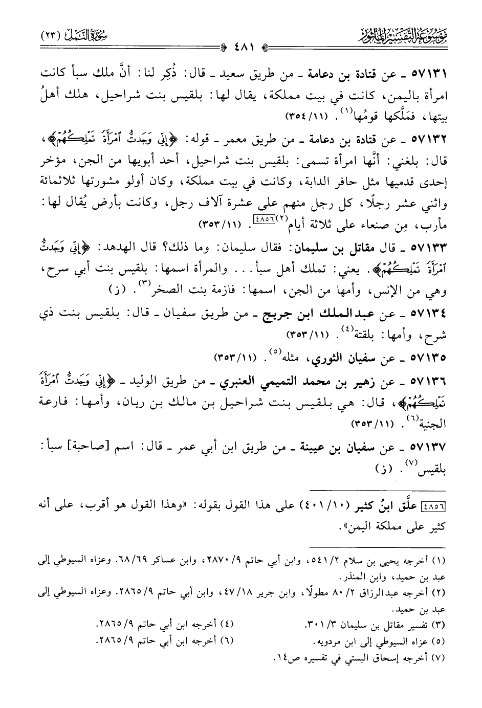 ٥٧١٣٦ - عن زهير بن محمد التميمي العنبري -من طريق الوليد- {إني وجدت امرأة تملكهم}، قال: هي بلقيس بنت شراحيل بن مالك بن ريان، وأمها: فارعة الجنية (¬٦). (١١/ ٣٥٣)