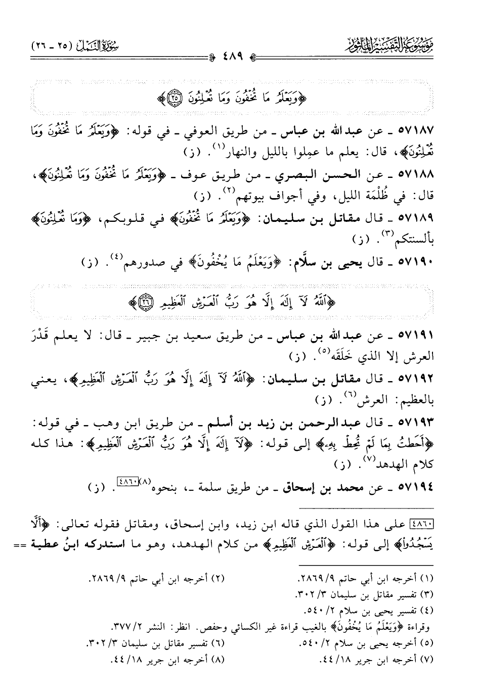 ٥٧١٨٩ - قال مقاتل بن سليمان: {ويعلم ما تخفون} في قلوبكم، {وما تعلنون} بألسنتكم (¬٣). (ز)