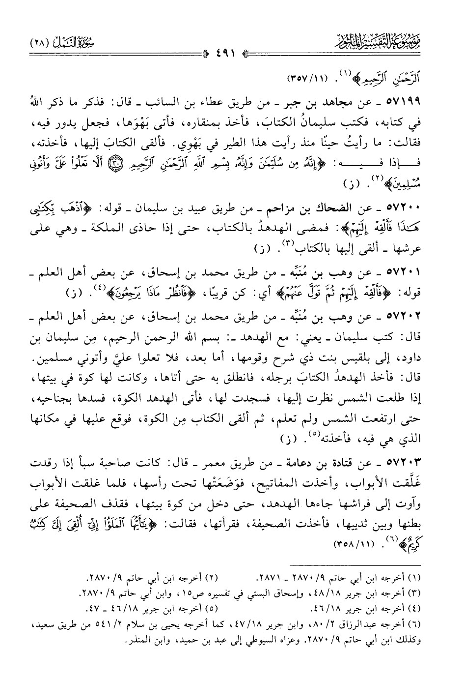 ٥٧٢٠٠ - عن الضحاك بن مزاحم -من طريق عبيد بن سليمان- قوله: {اذهب بكتابي هذا فألقه إليهم}: فمضى الهدهدُ بالكتاب، حتى إذا حاذى الملكة -وهي على عرشها- ألقى إليها بالكتاب (¬٣). (ز)