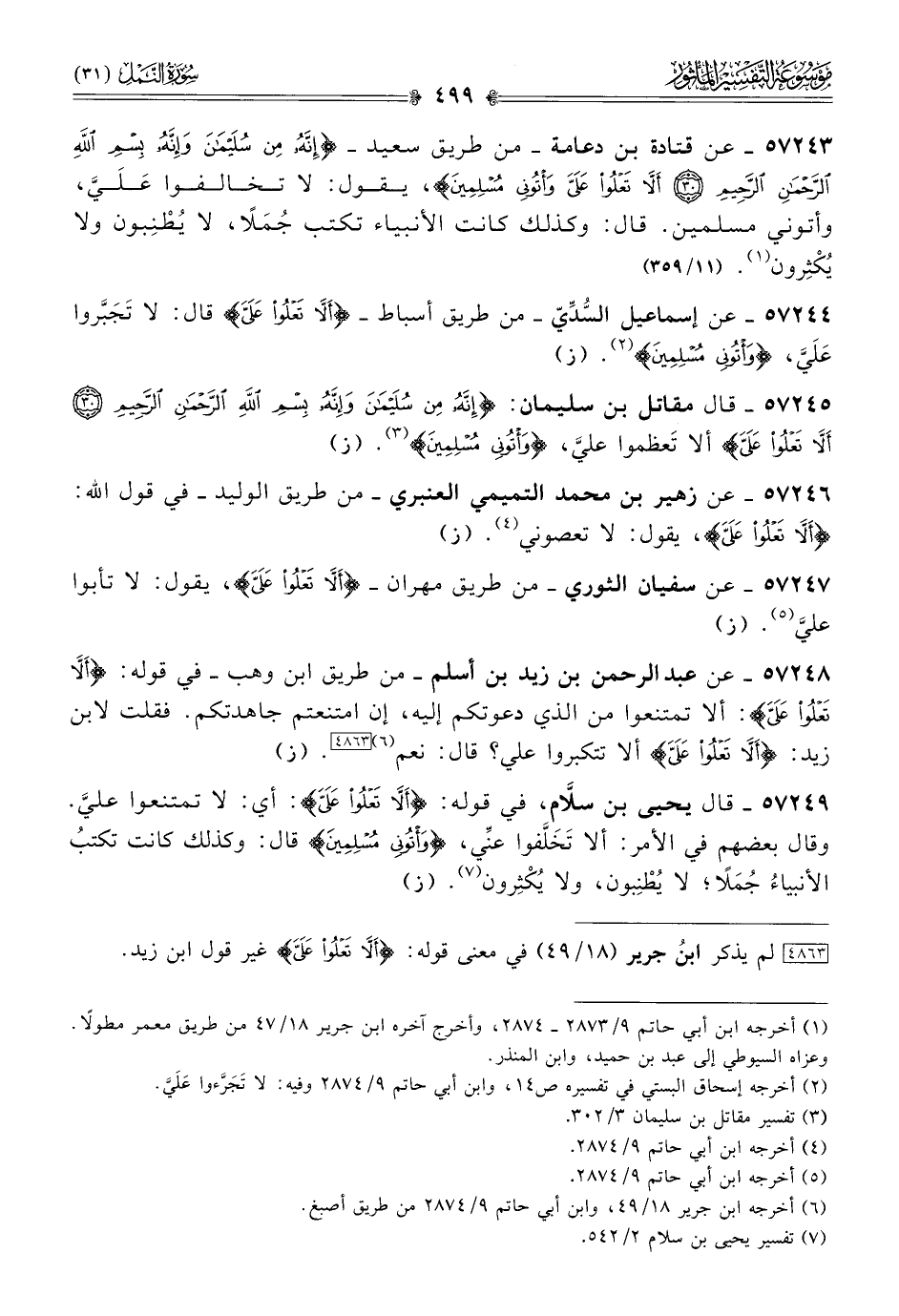 ٥٧٢٤٤ - عن إسماعيل السُّدِّيّ -من طريق أسباط- {أن لا تعلوا عليَّ} قال: لا تَجَبَّروا عَلَيَّ، {وأتوني مسلمين} (¬٢). (ز)
