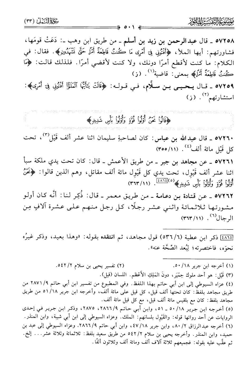 ٥٧٢٦١ - عن مجاهد بن جبر -من طريق الأعمش- قال: كان تحت يدي ملكة سبأ اثنا عشر ألف قَيْوِل، تحت يدي كل قَيْوِل مائة ألف مقاتل، وهم الذين قالوا: {نحن أولوا قوة وأولو بأس شديد} (¬٥) [٤٨٦٤]. (١١/ ٣٦٣)
