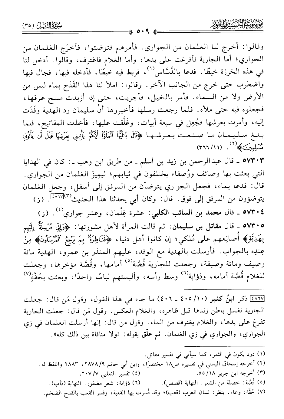 ٥٧٣٠٥ - قال مقاتل بن سليمان: ثم قالت المرأة لأهل مشورتها: {وإني مرسلة إليهم بهدية} أُصانِعهم على مُلكي؛ إن كانوا أهل دنيا، {فناظرة بم يرجع المرسلون} مِن عِندِه بالجواب. فأرسلت بالهدية مع الوفد، عليهم المنذر بن عمرو، الهدية مائة وصيف ومائة وصيفة، وجعلت للجارية قُصَّة (¬٥) أمامها، وقُصَّة مؤخرها، وجعلت للغلام قُصَّة أمامه، وذؤابة (¬٦) وسط رأسه، وألبستهم لباسًا واحدًا، وبعثت بحُقَّةٍ (¬٧)