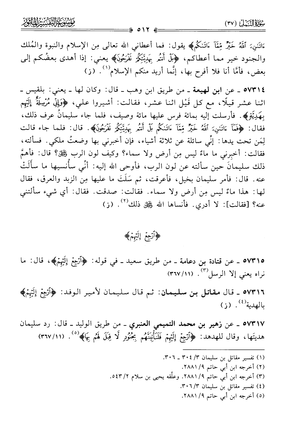 ٥٧٣١٦ - قال مقاتل بن سليمان: ثم قال سليمان لأمير الوفد: {ارجع إليهم} بالهدية (¬٤). (ز)