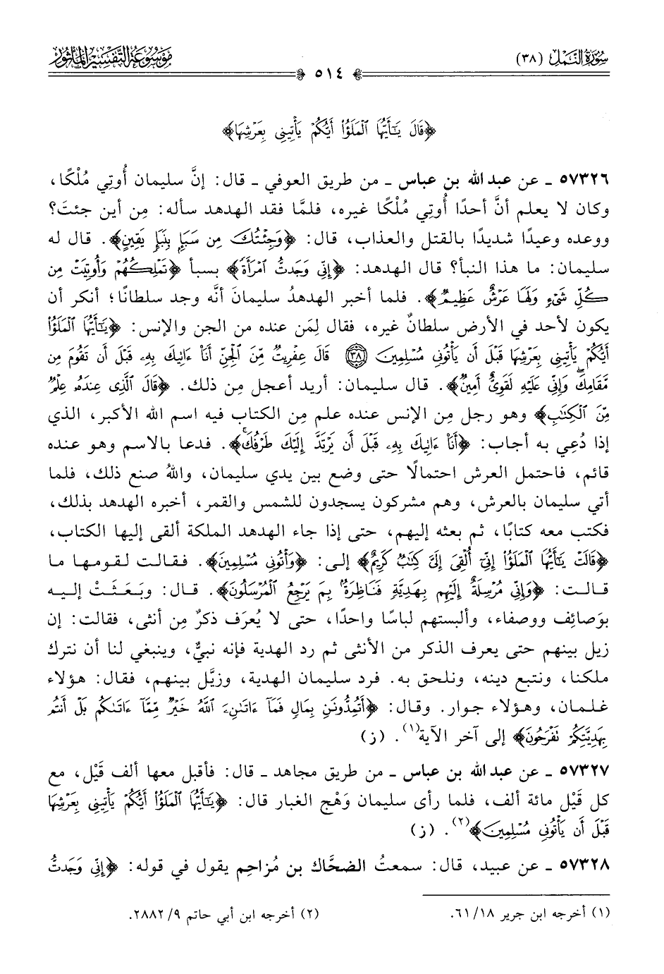 ٥٧٣٢٦ - عن عبد الله بن عباس -من طريق العوفي- قال: إنّ سليمان أُوتِي مُلْكًا، وكان لا يعلم أنّ أحدًا أُوتِي مُلْكًا غيره، فلمّا فقد الهدهد سأله: مِن أين جئتَ؟ ووعده وعيدًا شديدًا بالقتل والعذاب، قال: {جئتك من سبأ بنبأ يقين}. قال له سليمان: ما هذا النبأ؟ قال الهدهد: {إني وجدت امرأة} بسبأ {تملكهم، وأوتيت من كل شيء، ولها عرش عظيم}. فلما أخبر الهدهدُ سليمانَ أنّه وجد سلطانًا؛ أنكر أن يكون لأحد في الأرض سلطانٌ غيره، فقال لِمَن عنده من الجن والإنس: {يا أيها الملأ أيكم يأتيني بعرشها قبل أن يأتوني مسلمين. قال عفريت من الجن أنا آتيك به قبل أن تقوم من مقامك، وإني عليه لقوي أمين}. قال سليمان: أريد أعجل مِن ذلك. {قال الذي عنده علم من الكتاب} وهو رجل مِن الإنس عنده علم مِن الكتاب فيه اسم الله الأكبر، الذي إذا دُعِي به أجاب: {أنا آتيك به قبل أن يرتد إليك طرفك}. فدعا بالاسم وهو عنده قائم، فاحتمل العرش احتمالًا حتى وضع بين يدي سليمان، واللهُ صنع ذلك، فلما أتى سليمان بالعرش، وهم مشركون يسجدون للشمس والقمر، أخبره الهدهد بذلك، فكتب معه كتابًا، ثم بعثه إليهم، حتى إذا جاء الهدهد الملكة ألقى إليها الكتاب، {قالت يا أيها الملأ إني ألقي إلي كتاب كريم} إلى: {وأتوني مسلمين}. فقالت لقومها ما قالت: {وإني مرسلة إليهم بهدية فناظرة بم يرجع المرسلون}. قال: وبَعَثَتْ إليه بوَصائِف ووصفاء، وألبستهم لباسًا واحدًا، حتى لا يُعرَف ذكرٌ مِن أنثى، فقالت: إن زيل بينهم حتى يعرف الذكر من الأنثى ثم رد الهدية فإنه نبيٌّ، وينبغي لنا أن نترك ملكنا، ونتبع دينه، ونلحق به. فرد سليمان الهدية، وزيَّل بينهم، فقال: هؤلاء غلمان، وهؤلاء جوار. وقال: {أتمدونن بمال فما آتاني الله خير مما آتاكم بل أنتم بهديتكم تفرحون} إلى آخر الآية (¬١). (ز)