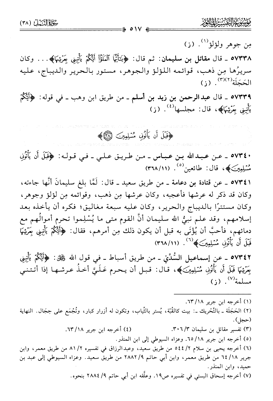 ٥٧٣٣٩ - قال عبد الرحمن بن زيد بن أسلم -من طريق ابن وهب- في قوله: {أيكم يأتيني بعرشها}، قال: مجلسها (¬٤). (ز)