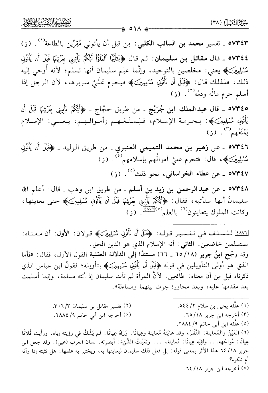٥٧٣٤٥ - قال عبد الملك ابن جُرَيْج -من طريق حجّاج- {أيكم يأتيني بعرشها قبل أن يأتوني مسلمين}: بحرمة الإسلام، فيَمنَعَهم وأموالهم، يعني: الإسلام يَمْنَعُهم (¬٣). (ز)