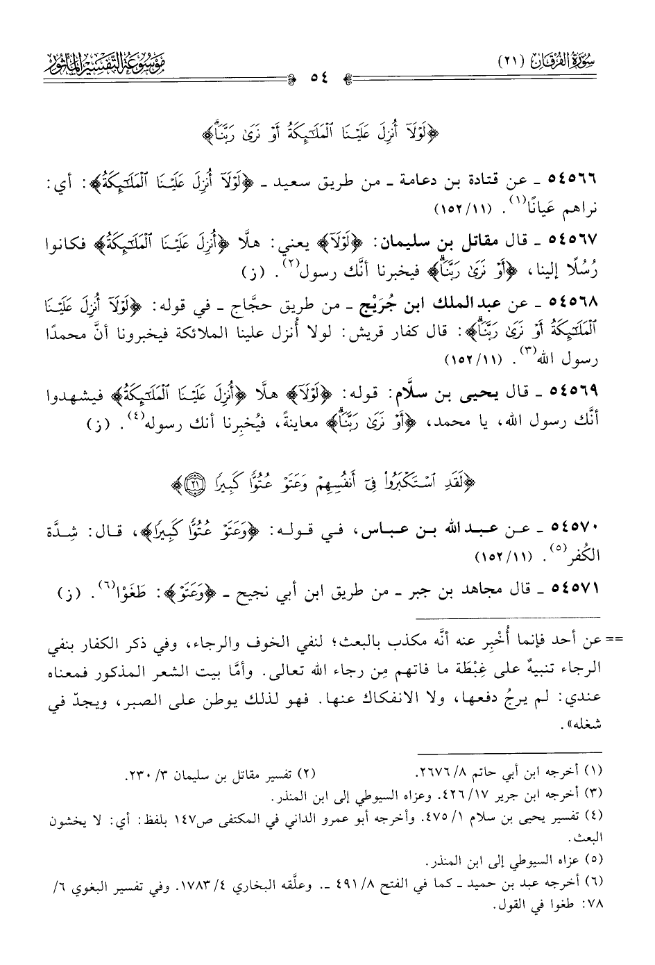 ٥٤٥٦٨ - عن عبد الملك ابن جُرَيْج -من طريق حجّاج- في قوله: {لولا أنزل علينا الملائكة أو نرى ربنا}: قال كفار قريش: لولا أُنزل علينا الملائكة فيخبرونا أنّ محمدًا رسول الله (¬٣). (١١/ ١٥٢)