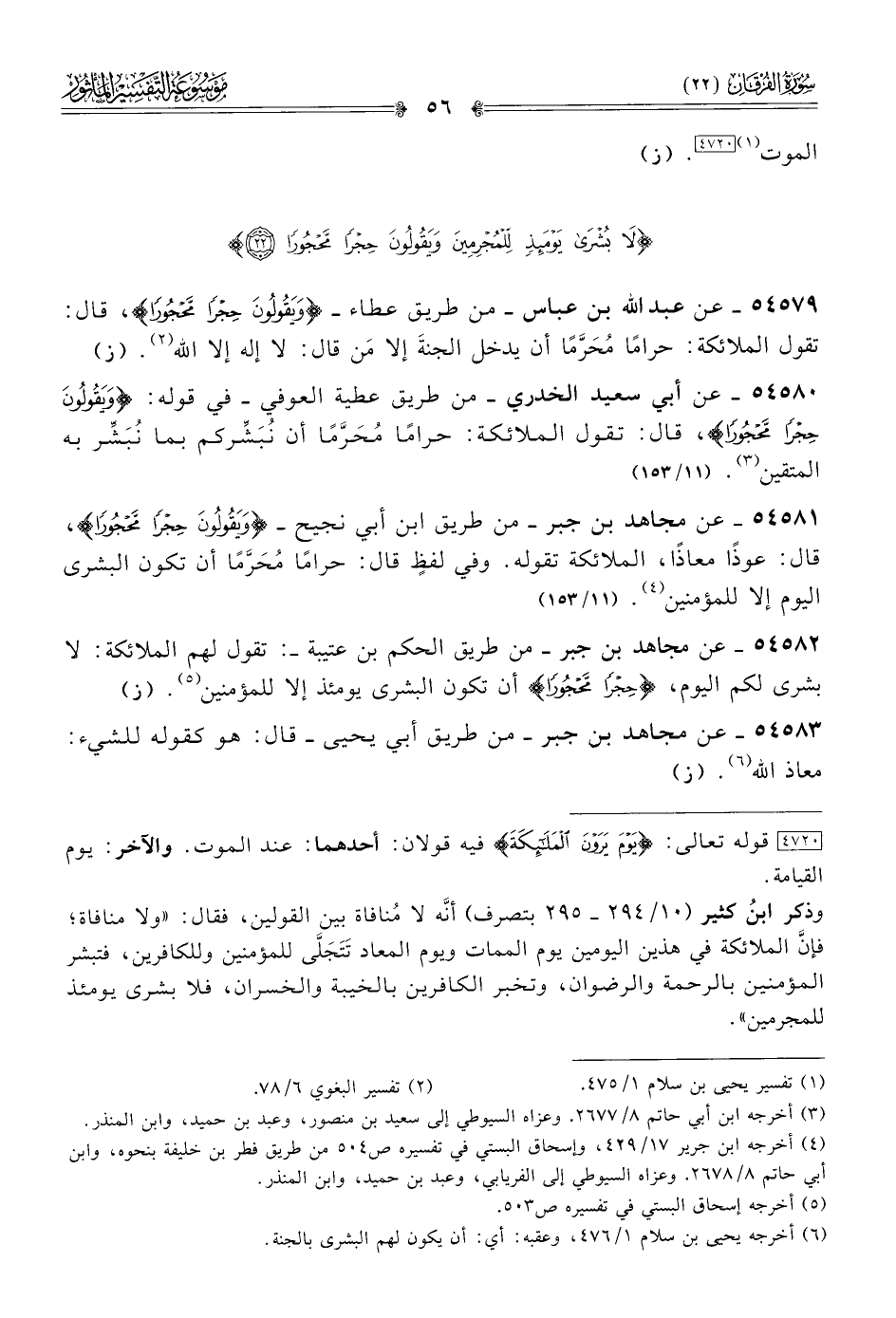 ٥٤٥٨١ - عن مجاهد بن جبر -من طريق ابن أبي نجيح- {ويقولون حجرا محجورا}، قال: عوذًا معاذًا، الملائكة تقوله. وفي لفظٍ قال: حرامًا مُحَرَّمًا أن تكون البشرى اليوم إلا للمؤمنين (¬٤). (١١/ ١٥٣)