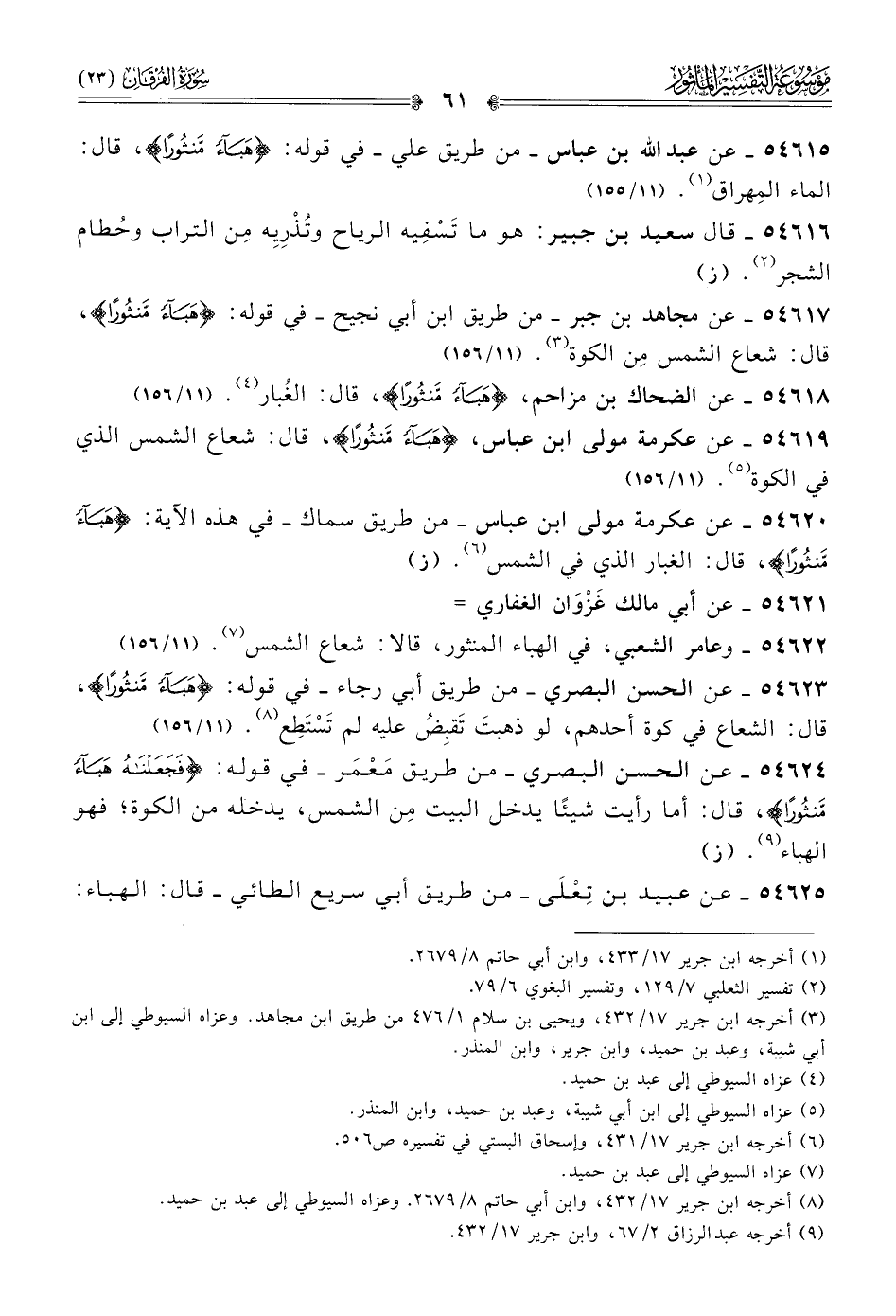 ٥٤٦٢٠ - عن عكرمة مولى ابن عباس -من طريق سماك- في هذه الآية: {هباء منثورا}، قال: الغبار الذي في الشمس (¬٦). (ز)