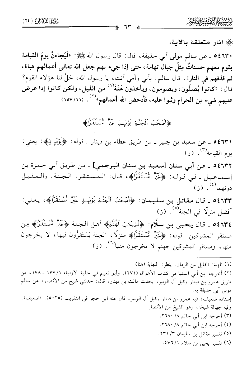 ٥٤٦٣٢ - عن أبي سنان [سعيد بن سنان البرجمي]-من طريق أبي حمزة بن إسماعيل- في قوله: {خير مستقرًا}، قال: المستقر: الجنة. والمقيل دونهما (¬٤). (ز)