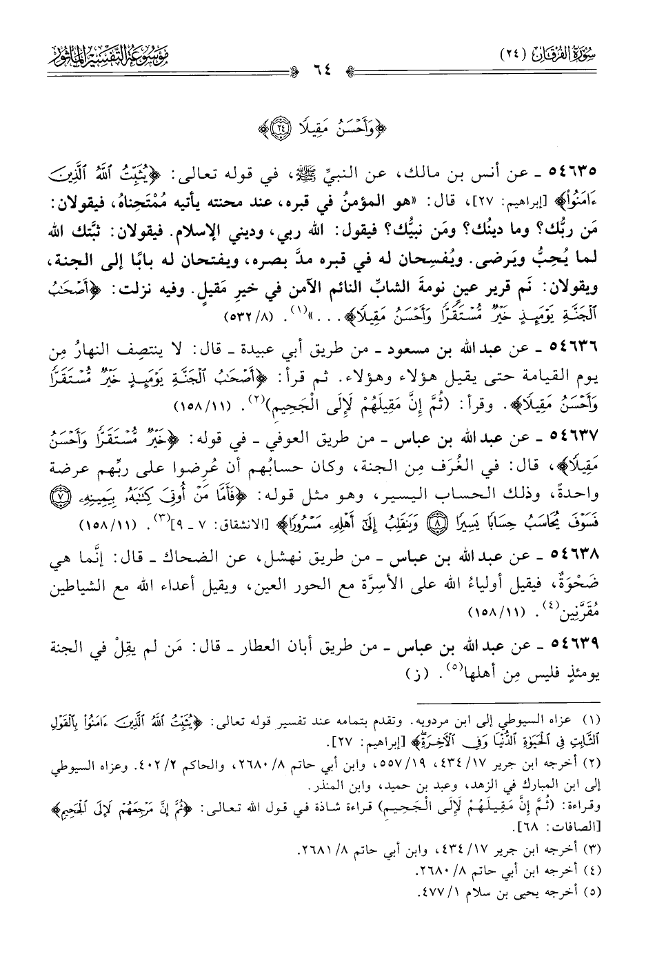 ٥٤٦٣٧ - عن عبد الله بن عباس -من طريق العوفي- في قوله: {خير مستقرًا وأحسن مقيلا}، قال: في الغُرَف مِن الجنة، وكان حسابُهم أن عُرِضوا على ربِّهم عرضة واحدةً، وذلك الحساب اليسير، وهو مثل قوله: {فأما من أوتي كتابه بيمينه (٧) فسوف يحاسب حسابا يسيرا (٨) وينقلب إلى أهله مسرورا} [الانشقاق: ٧ - ٩] (¬٣). (١١/ ١٥٨)