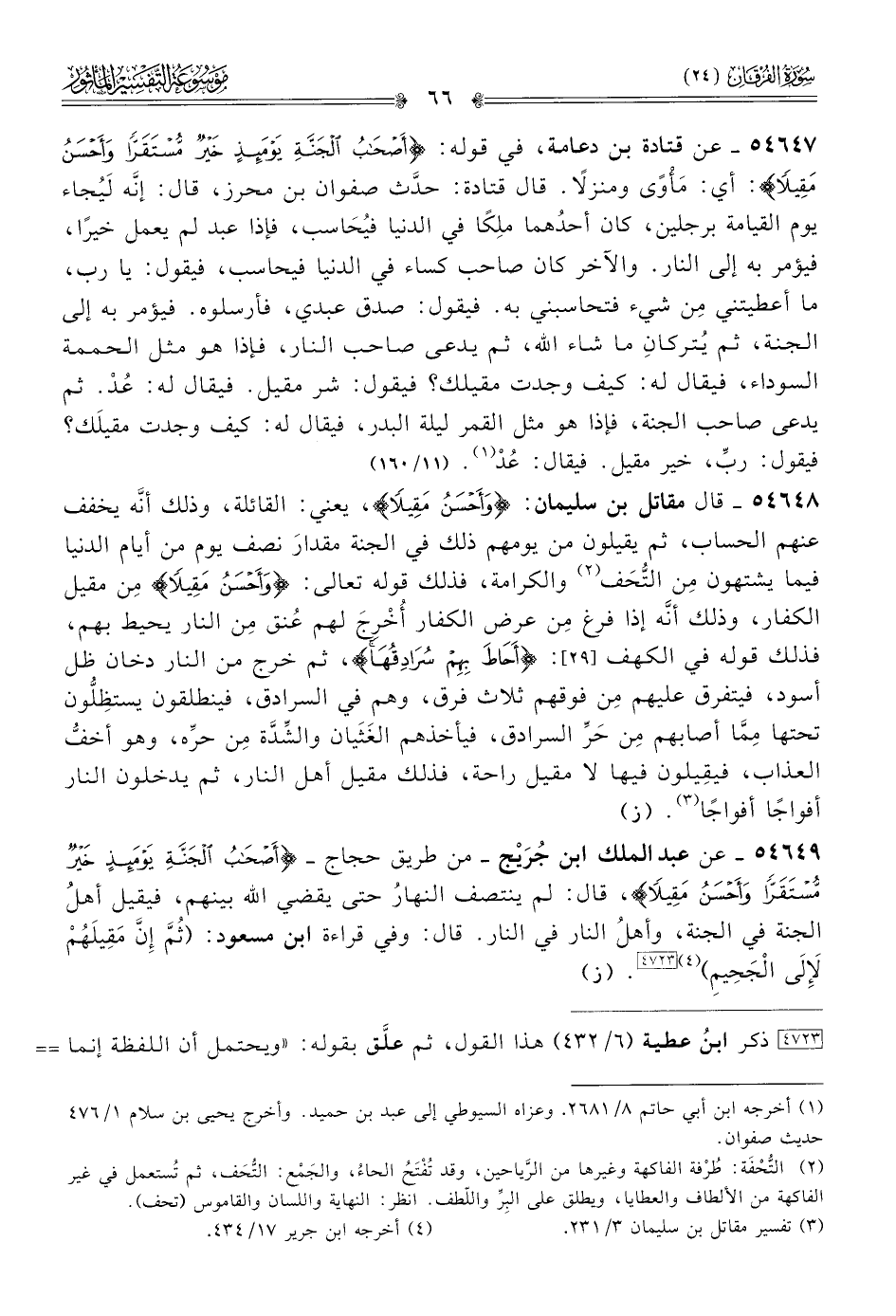 ٥٤٦٤٩ - عن عبد الملك ابن جُرَيْج -من طريق حجاج- {أصحاب الجنة يومئذ خير مستقرا وأحسن مقيلا}، قال: لم ينتصف النهارُ حتى يقضي الله بينهم، فيقيل أهلُ الجنة في الجنة، وأهلُ النار في النار. قال: وفي قراءة ابن مسعود: (ثُمَّ إنَّ مَقِيلَهُمْ لَإلى الجَحِيمِ) (¬٤) [٤٧٢٣]. (ز)