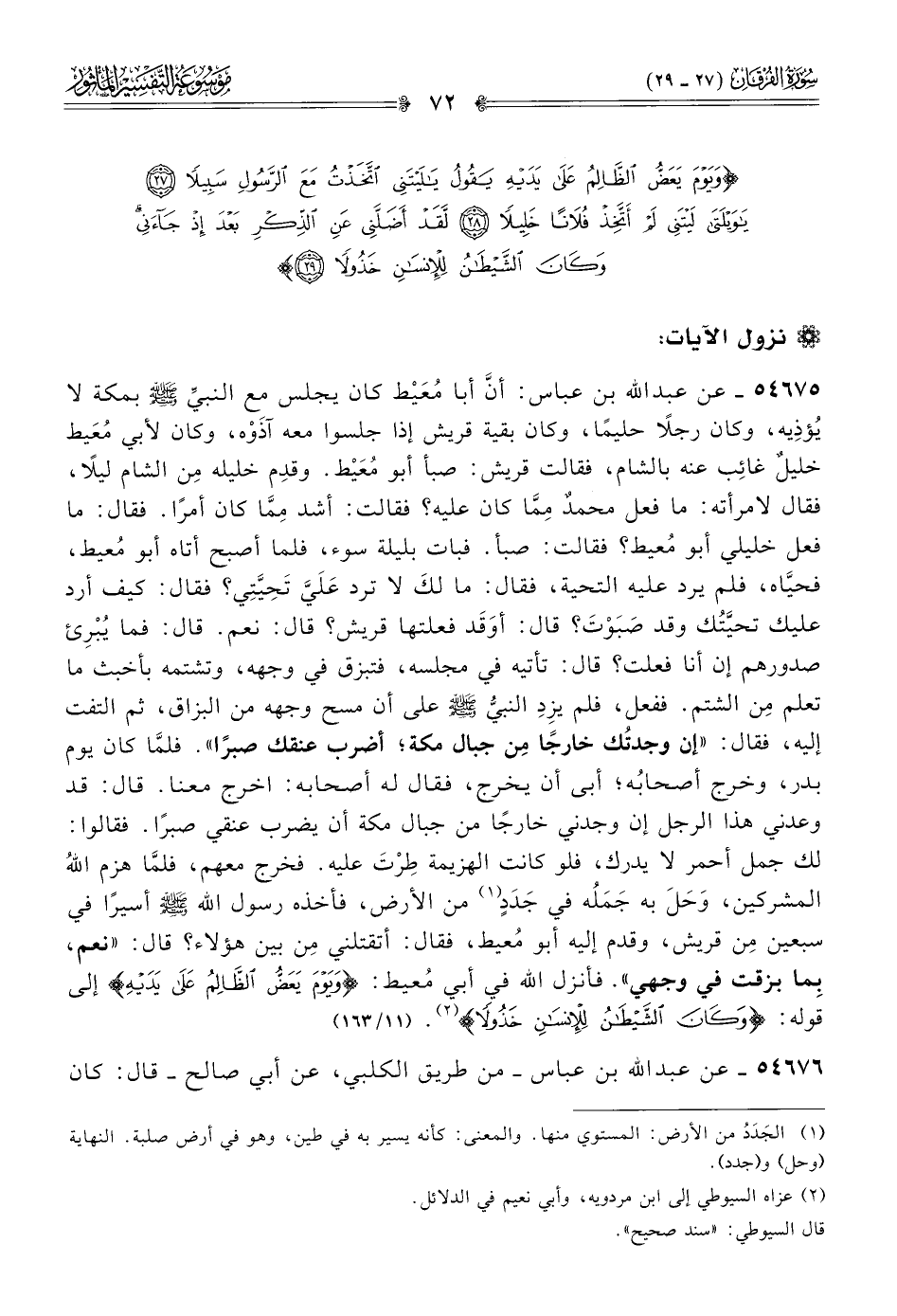 ٥٤٦٧٥ - عن عبد الله بن عباس: أنّ أبا مُعَيْط كان يجلس مع النبيِّ - صلى الله عليه وسلم - بمكة لا يُؤذِيه، وكان رجلًا حليمًا، وكان بقية قريش إذا جلسوا معه آذَوْه، وكان لأبي مُعَيط خليلٌ غائِب عنه بالشام، فقالت قريش: صبأ أبو مُعَيْط. وقدِم خليله مِن الشام ليلًا، فقال لامرأته: ما فعل محمدٌ مِمّا كان عليه؟ فقالت: أشد مِمّا كان أمرًا. فقال: ما فعل خليلي أبو مُعيط؟ فقالت: صبأ. فبات بليلة سوء، فلما أصبح أتاه أبو مُعيط، فحيّاه، فلم يرد عليه التحية، فقال: ما لكَ لا ترد عَلَيَّ تَحِيَّتِي؟ فقال: كيف أرد عليك تحيَّتُك وقد صَبَوْتَ؟ قال: أوَقَد فعلتها قريش؟ قال: نعم. قال: فما يُبْرِئ صدورهم إن أنا فعلت؟ قال: تأتيه في مجلسه، فتبزق في وجهه، وتشتمه بأخبث ما تعلم مِن الشتم. ففعل، فلم يزِدِ النبيُّ - صلى الله عليه وسلم - على أن مسح وجهه من البزاق، ثم التفت إليه، فقال: «إن وجدتُك خارجًا مِن جبال مكة؛ أضرب عنقك صبرًا». فلمّا كان يوم بدر، وخرج أصحابُه؛ أبى أن يخرج، فقال له أصحابه: اخرج معنا. قال: قد وعدني هذا الرجل إن وجدني خارجًا من جبال مكة أن يضرب عنقي صبرًا. فقالوا: لك جمل أحمر لا يدرك، فلو كانت الهزيمة طِرْتَ عليه. فخرج معهم، فلمّا هزم اللهُ المشركين، وحَلَ به جَمَلُه في جَدَدٍ (¬١) من الأرض، فأخذه رسول الله - صلى الله عليه وسلم - أسيرًا في سبعين مِن قريش، وقدم إليه أبو مُعيط، فقال: أتقتلني مِن بين هؤلاء؟ قال: «نعم، بِما بزقت في وجهي». فأنزل الله في أبي مُعيط: {ويوم يعض الظالم على يدي} إلى قوله: {وكان الشيطان للإنسان خذولا} (¬٢). (١١/ ١٦٣)