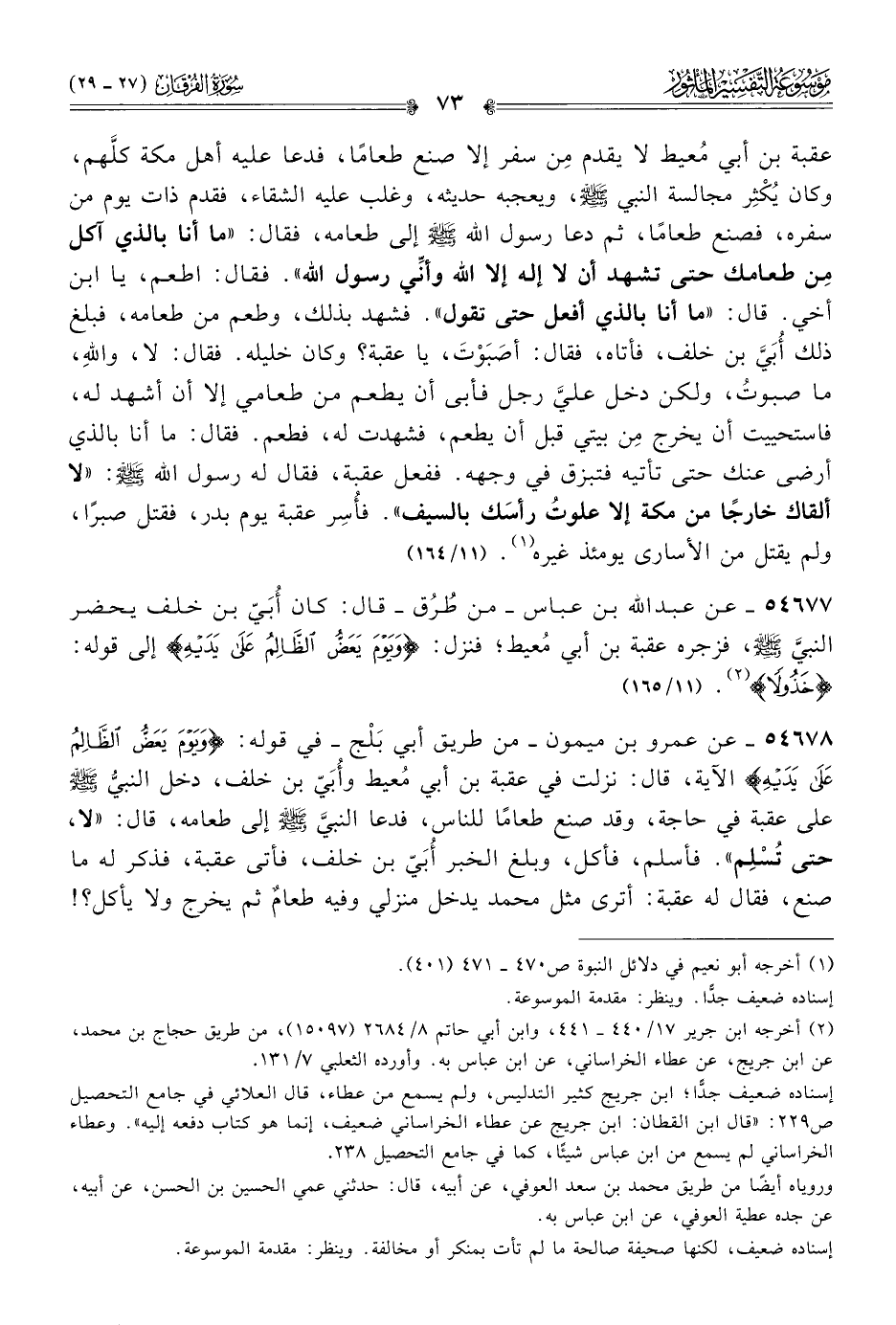 ٥٤٦٧٨ - عن عمرو بن ميمون -من طريق أبي بَلْج- في قوله: {ويوم يعض الظالم على يديه} الآية، قال: نزلت في عقبة بن أبي مُعيط وأُبَيّ بن خلف، دخل النبيُّ - صلى الله عليه وسلم - على عقبة في حاجة، وقد صنع طعامًا للناس، فدعا النبيَّ - صلى الله عليه وسلم - إلى طعامه، قال: «لا، حتى تُسْلِم». فأسلم، فأكل، وبلغ الخبر أُبَيّ بن خلف، فأتى عقبة، فذكر له ما صنع، فقال له عقبة: أترى مثل محمد يدخل منزلي وفيه طعامٌ ثم يخرج ولا يأكل؟!