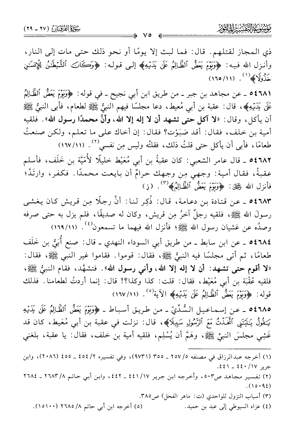٥٤٦٨٤ - عن ابن سابط -من طريق أبي السوداء النهدي- قال: صنع أُبَيُّ بن خَلَف طعامًا، ثم أتى مجلسًا فيه النبيُّ - صلى الله عليه وسلم -، فقال: قوموا. فقاموا غير النبي - صلى الله عليه وسلم -، فقال: «لا أقوم حتى تشهد: أن لا إله إلا الله، وأني رسول الله». فتشهَّد، فقام النبيُّ - صلى الله عليه وسلم -، فلقيه عُقْبَة بن أبي مُعَيْط، فقال: قلت: كذا وكذا؟! قال: إنما أردتُ لطعامنا. فذلك قوله: {ويوم يعض الظالم على يديه} الآية (¬٥). (١١/ ١٦٧)