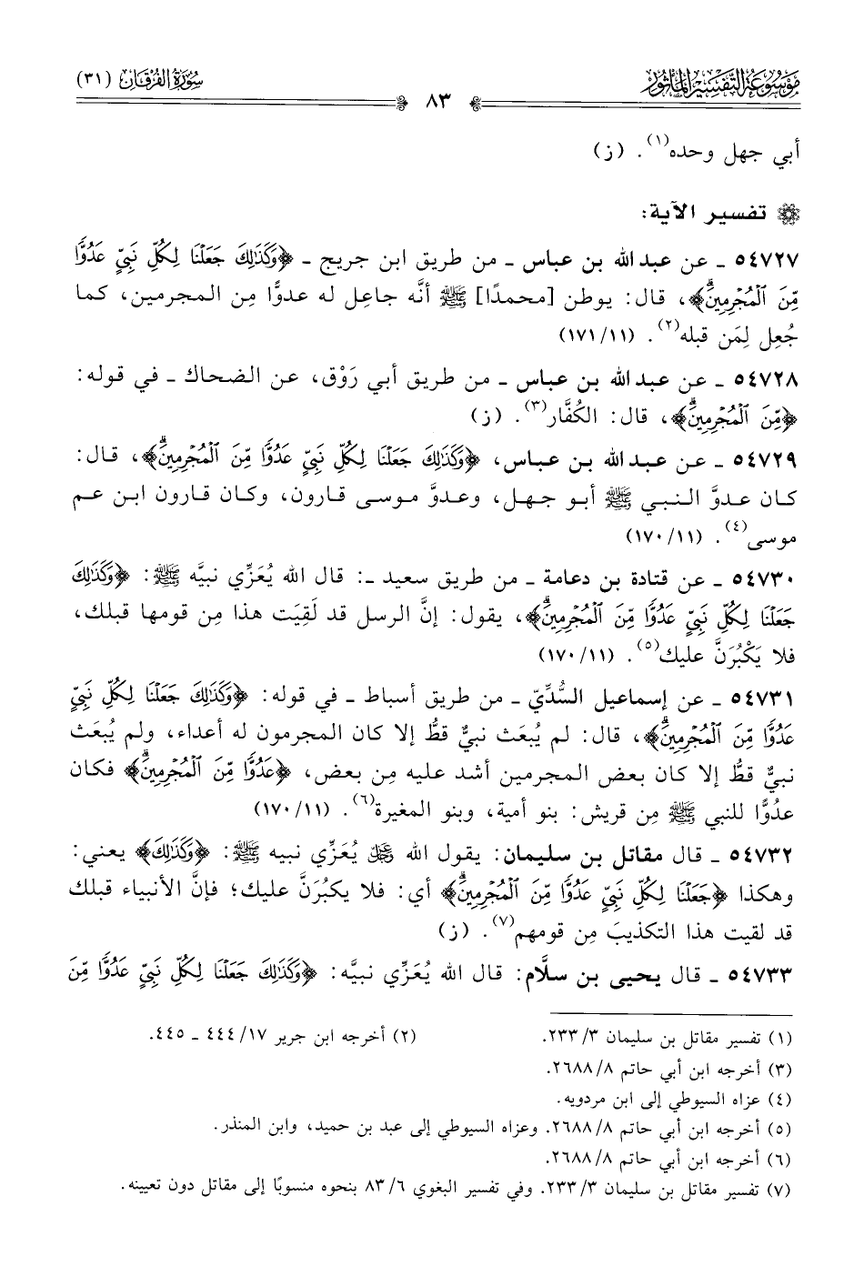 ٥٤٧٣٣ - قال يحيى بن سلّام: قال الله يُعَزِّي نبيَّه: {وكذلك جعلنا لكل نبي عدوا من
