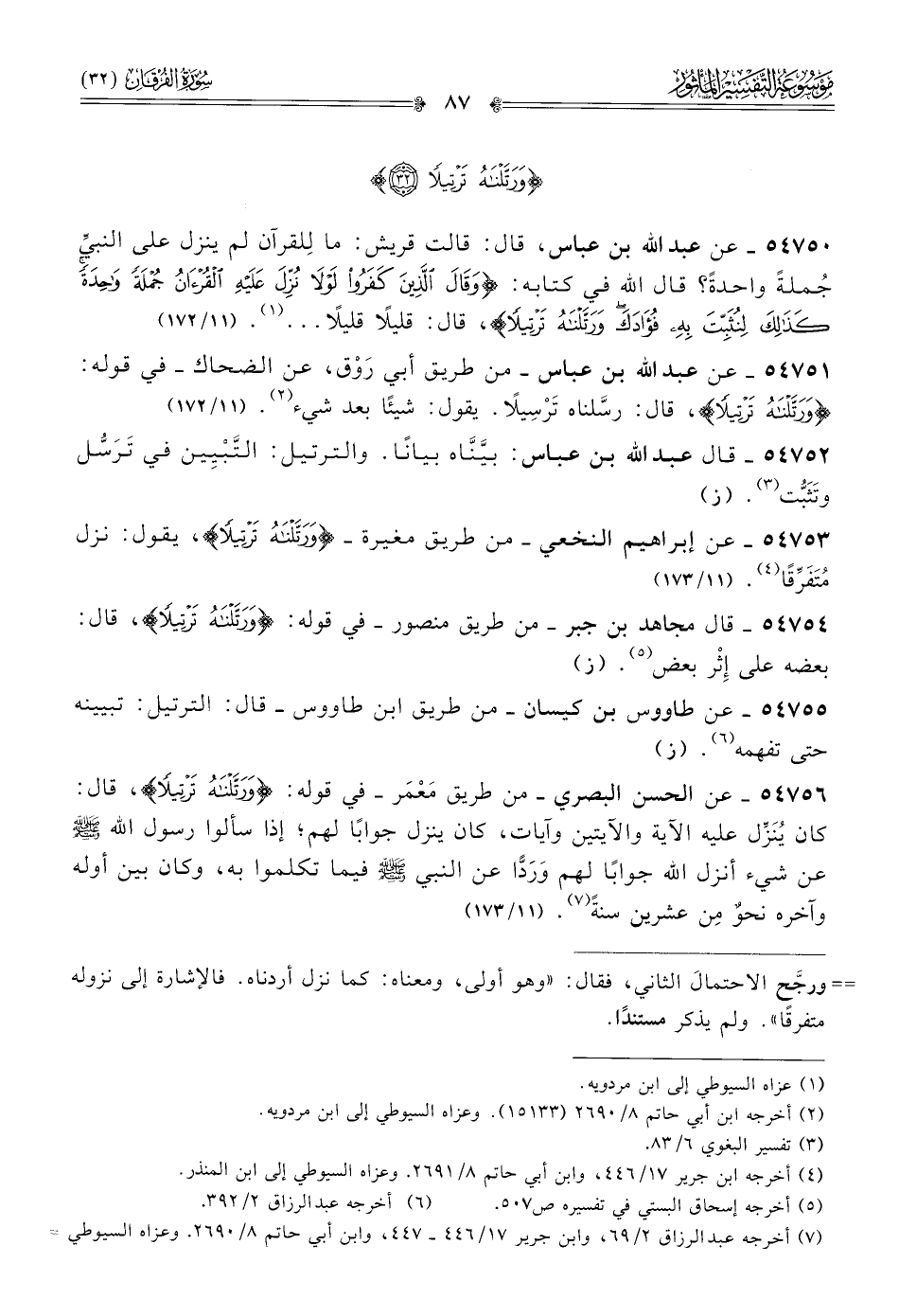 ٥٤٧٥٤ - قال مجاهد بن جبر -من طريق منصور- في قوله: {ورتلناه ترتيلا}، قال: بعضه على إثْر بعض (¬٥). (ز)