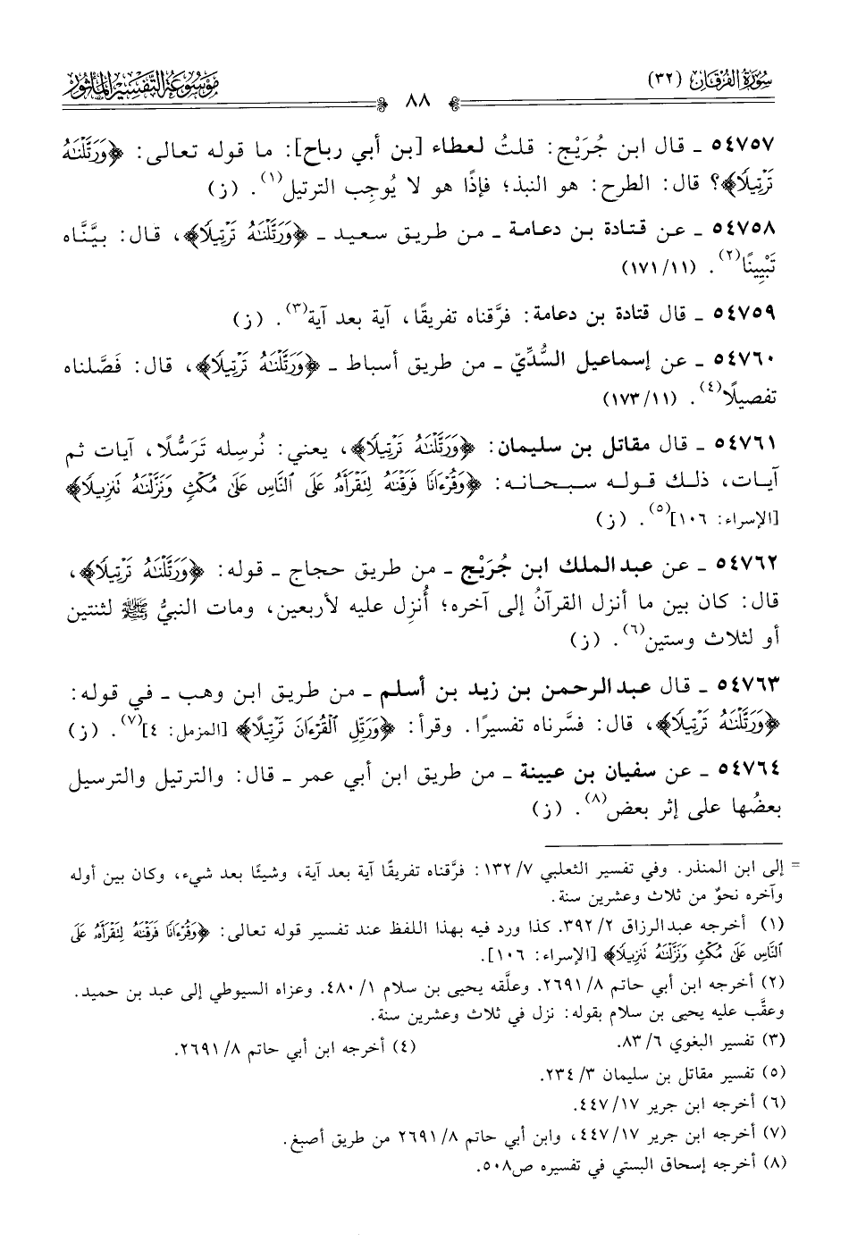 ٥٤٧٦٠ - عن إسماعيل السُّدِّيّ -من طريق أسباط- {ورتلناه ترتيلا}، قال: فَصَّلناه تفصيلًا (¬٤). (١١/ ١٧٣)