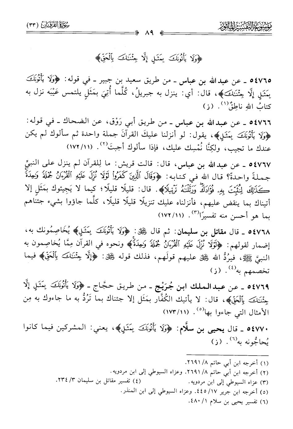 ٥٤٧٦٥ - عن عبد الله بن عباس -من طريق سعيد بن جبير- في قوله: {ولا يأتونك بمثل إلا جئناك}، قال: أي: ينزل به جبريلُ، كُلَّما أُتِيَ بمَثَلٍ يلتمس عَيْبَه نزل به كتابُ اللهِ ناطِقٌ (¬١). (ز)