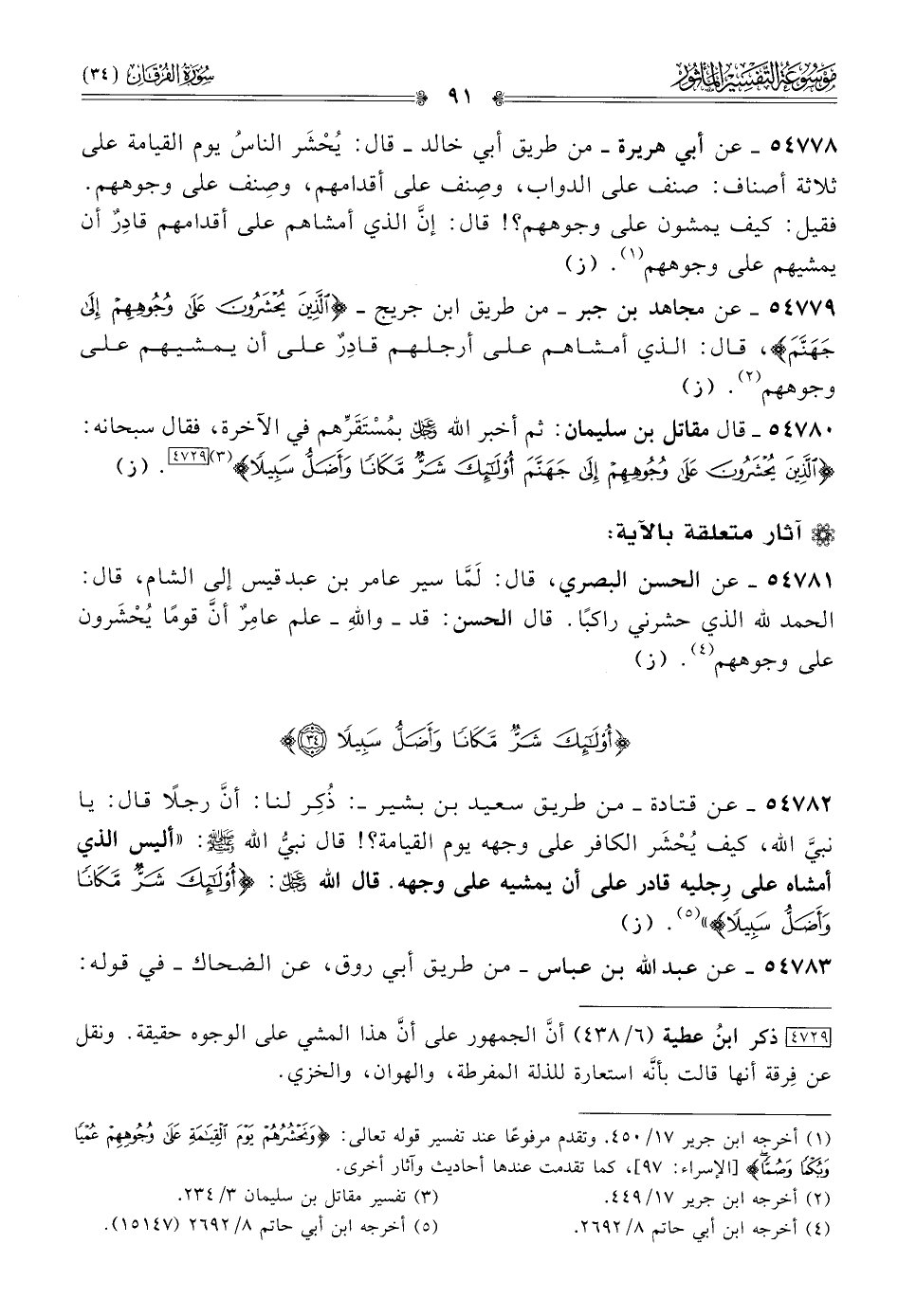 ٥٤٧٨٠ - قال مقاتل بن سليمان: ثم أخبر الله - عز وجل - بمُسْتَقَرِّهم في الآخرة، فقال سبحانه: {الذين يحشرون على وجوههم إلى جهنم أولئك شر مكانا وأضل سبيلا} (¬٣) [٤٧٢٩]. (ز)