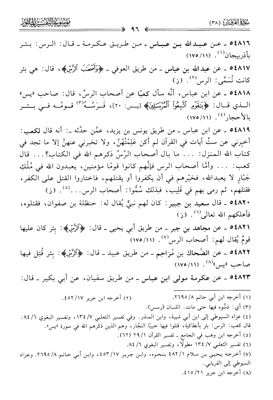 ٥٤٨١٦ - عن عبد الله بن عباس -من طريق عكرمة- قال: الرس: بئر بأذربيجان (¬١). (١١/ ١٧٥)