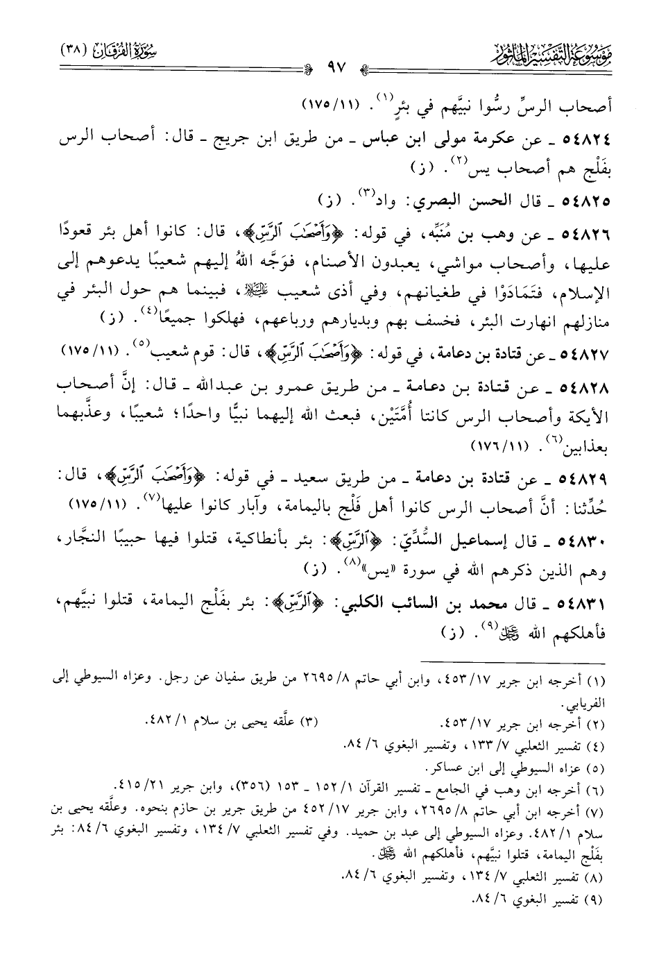 ٥٤٨٢٩ - عن قتادة بن دعامة -من طريق سعيد- في قوله: {وأصحاب الرس}، قال: حُدِّثنا: أنّ أصحاب الرس كانوا أهل فَلْج باليمامة، وآبار كانوا عليها (¬٧). (١١/ ١٧٥)