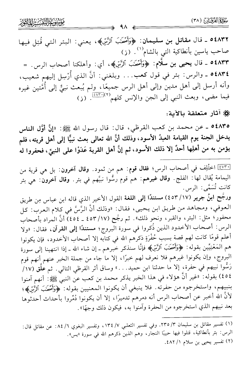 ٥٤٨٣٢ - قال مقاتل بن سليمان: {وأصحاب الرس}، يعني: البئر التي قُتِل فيها صاحب ياسين بأنطاكية التي بالشام (¬١). (ز)