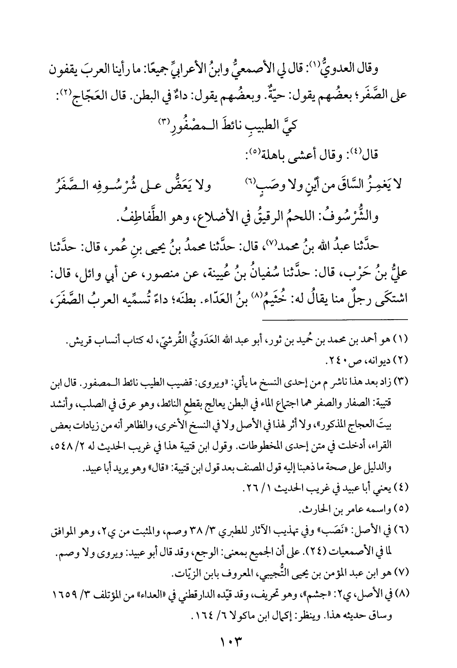 (¬٣) زاد بعد هذا ناشر م من إحدى النسخ ما يأتي: "ويروى: قضيب الطيب نائط المصفور. قال ابن قتيبة: الصفار والصفر هما اجتماع الماء في البطن يعالج بقطعِ النائط، وهو عرق في الصلب، وأنشد بيتَ العجاج المذكور"، ولا أثر لهذا في الأصل ولا في النسخ الأخرى، والظاهر أنه من زيادات بعض القراء، أدخلت في متن إحدى المخطوطات. وقول ابن قتيبة هذا في غريب الحديث له ٢/ ٥٤٨، والدليل على صحة ما ذهبنا إليه قول المصنف بعد قول ابن قتيبة: "قال" وهو يريد أبا عبيد.