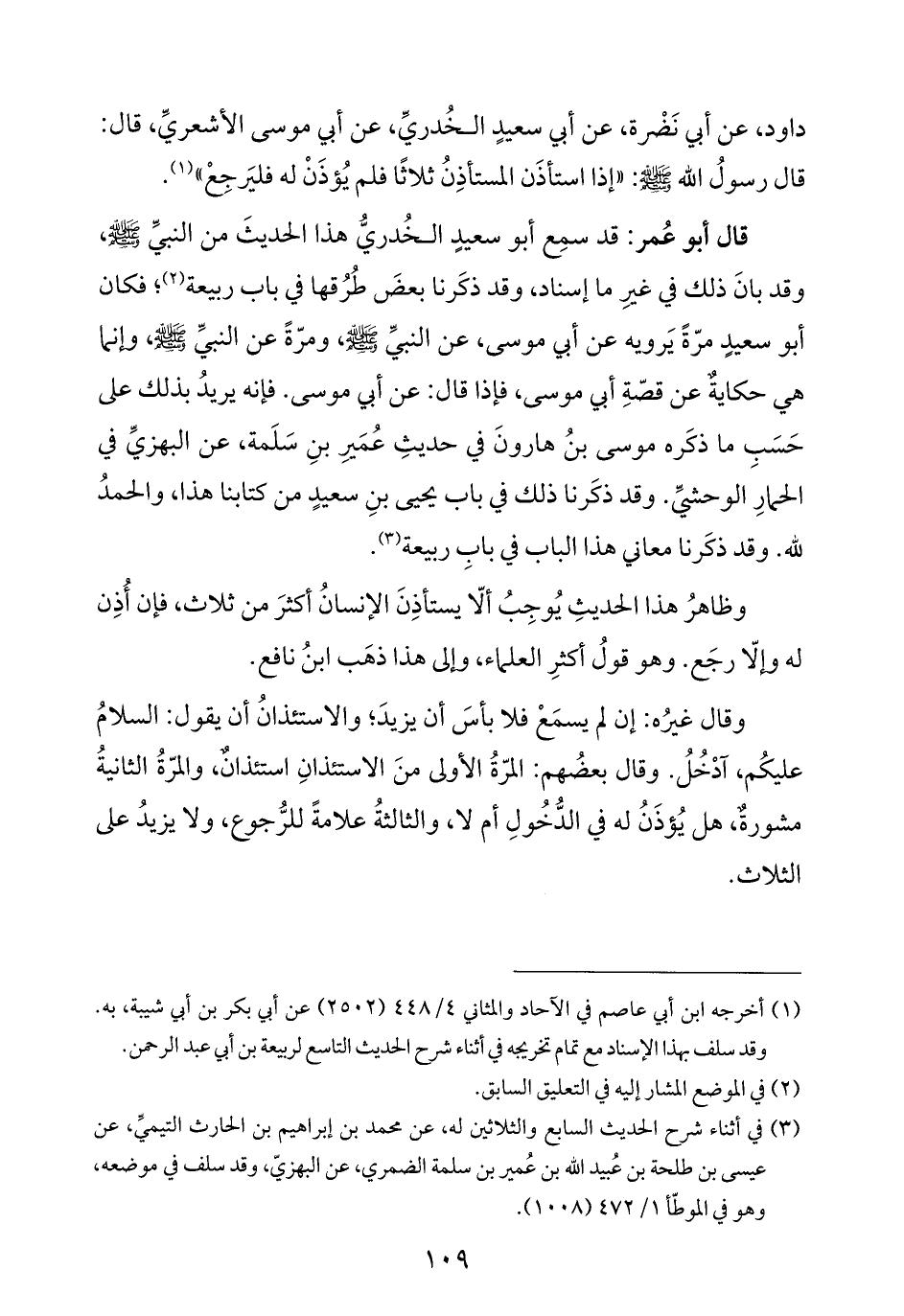 وظاهرُ هذا الحديثِ يُوجِبُ ألّا يستأذِنَ الإنسانُ أكثرَ من ثلاث، فإن أُذِن له وإلّا رجَع. وهو قولُ أكثرِ العلماء، وإلى هذا ذهَب ابنُ نافع.
