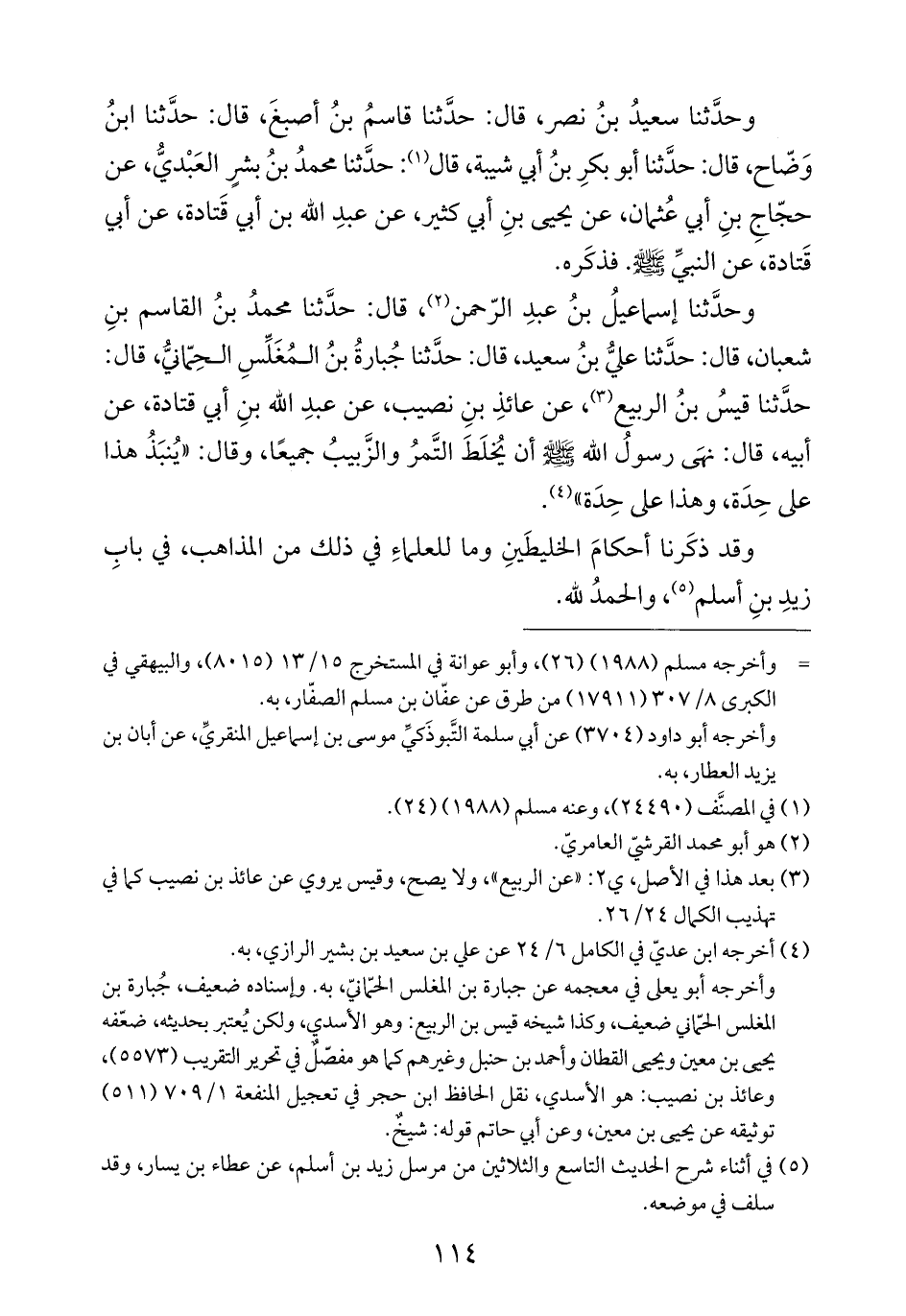 وحدَّثنا إسماعيلُ بنُ عبدِ الرّحمن (¬٢)، قال: حدَّثنا محمدُ بنُ القاسم بنِ شعبان، قال: حدَّثنا عليُّ بنُ سعيد، قال: حدَّثنا جُبارةُ بنُ المُغَلِّسِ الحِمّانيُّ، قال: حدَّثنا قيسُ بنُ الربيع (¬٣)، عن عائذِ بنِ نصيب، عن عبدِ الله بنِ أبي قتادة، عن أبيه، قال: نهَى رسولُ الله -صلي الله عليه وسلَّم- أن يُخلَطَ التَّمرُ والزَّبيبُ جميعًا، وقال: "يُنبَذُ هذا على حِدَة، وهذا على حِدَة" (¬٤).