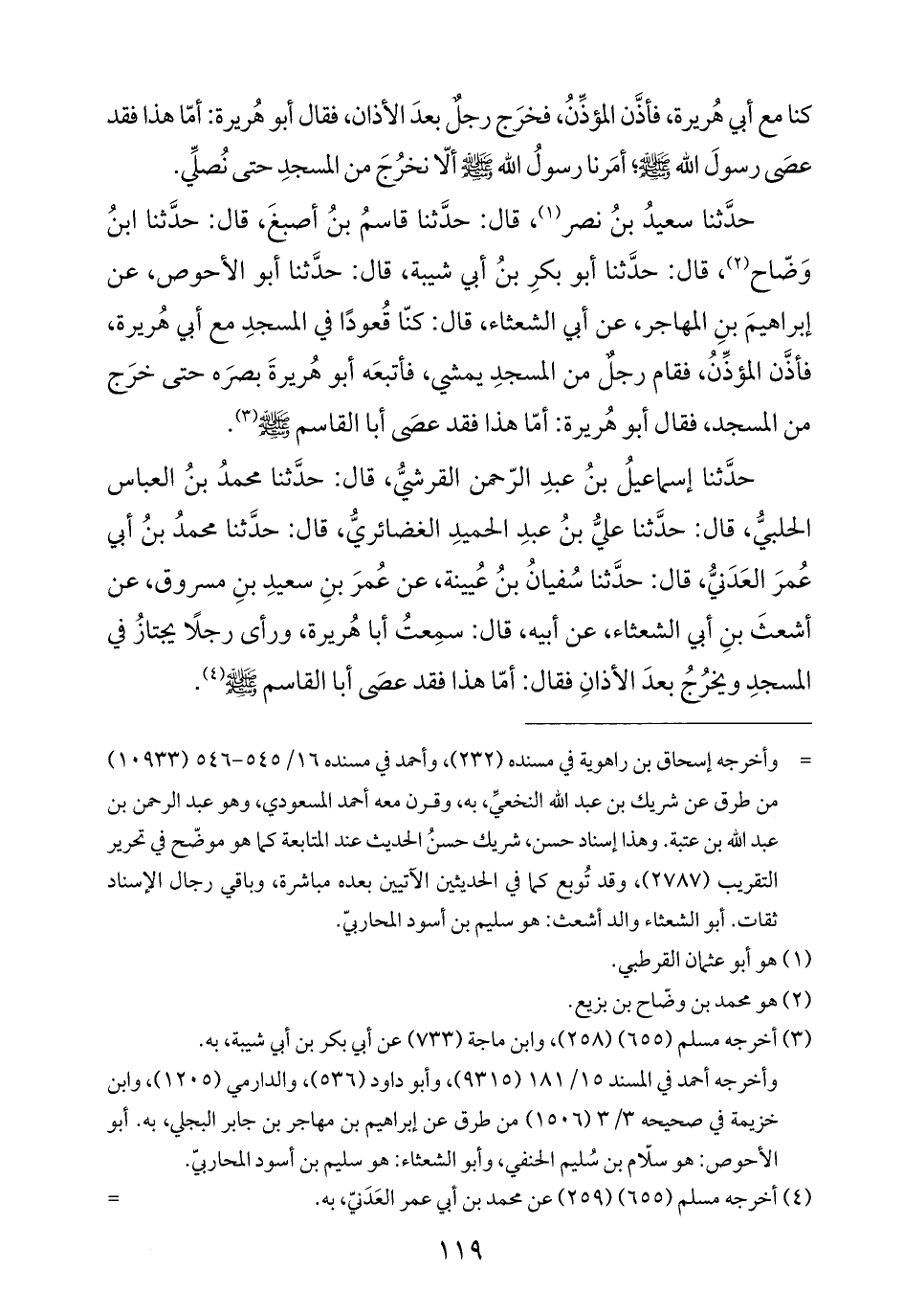 حدَّثنا إسماعيلُ بنُ عبدِ الرّحمن القرشيُّ، قال: حدَّثنا محمدُ بنُ العباس الحلبيُّ، قال: حدَّثنا عليُّ بنُ عبدِ الحميدِ الغضائريُّ، قال: حدَّثنا محمدُ بنُ أبي عُمرَ العَدَنيُّ، قال: حدَّثنا سُفيانُ بنُ عُيينة، عن عُمرَ بنِ سعيدِ بنِ مسروق، عن أشعثَ بنِ أبي الشعثاء، عن أبيه، قال: سمِعتُ أبا هُريرة، ورأى رجلًا يجتازُ في المسجدِ ويخرُجُ بعدَ الأذانِ فقال: أمّا هذا فقد عصَى أبا القاسم -صلى الله عليه وسلم- (¬٤).