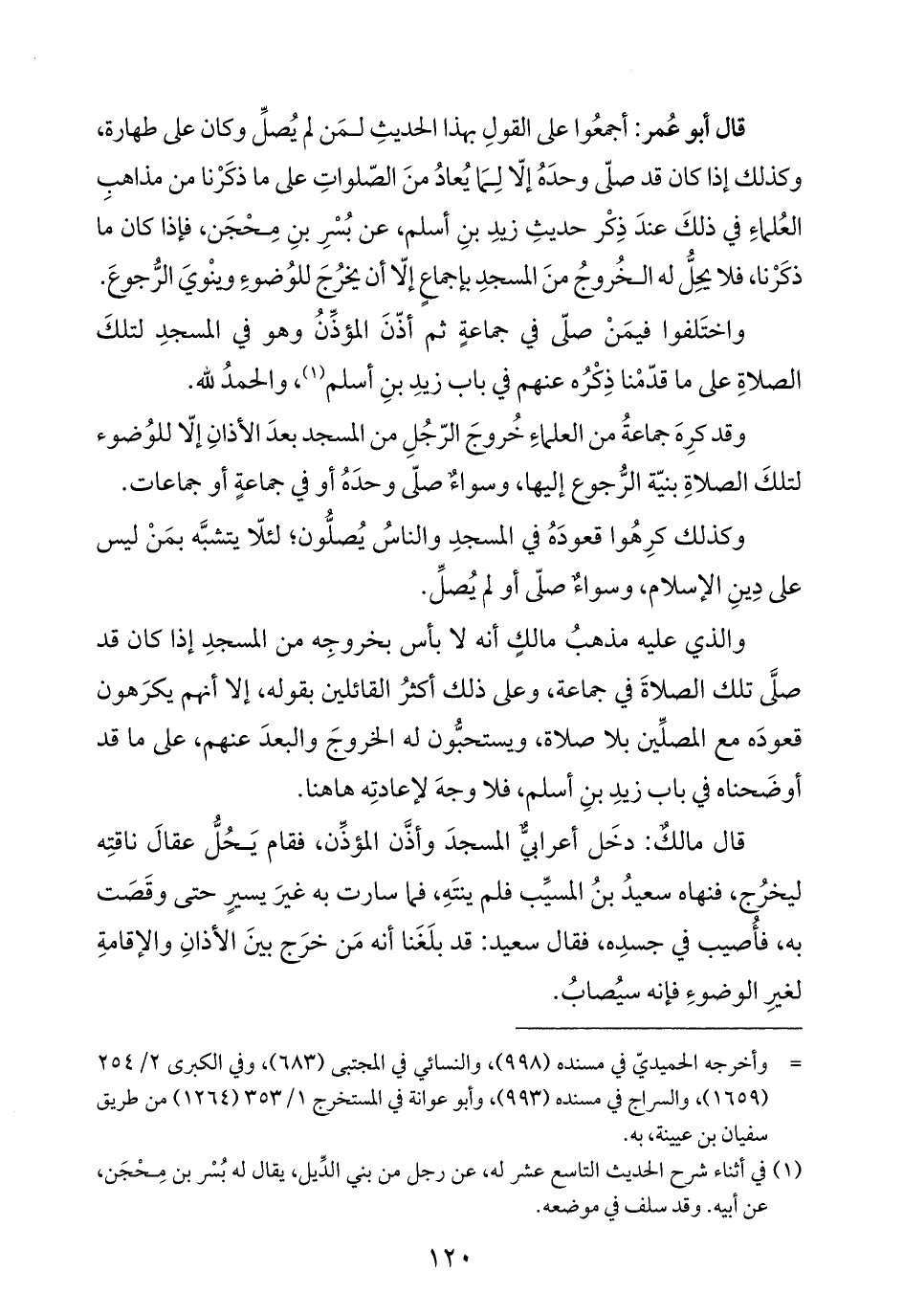 قال أبو عُمر: أجمعُوا على القولِ بهذا الحديثِ لمَن لم يُصلِّ وكان على طهارة، وكذلك إذا كان قد صلّى وحدَهُ إلّا لِمَا يُعادُ منَ الصّلواتِ على ما ذكَرْنا من مذاهبِ العُلماءِ في ذلكَ عندَ ذِكْر حديثِ زيدِ بنِ أسلم، عن بُسْرِ بنِ مِحْجَن، فإذا كان ما ذكَرْنا، فلا يحِلُّ له الخُروجُ منَ المسجدِ بإجماعٍ إلّا أن يخرُجَ للوُضوءِ وينْويَ الرُّجوعَ.