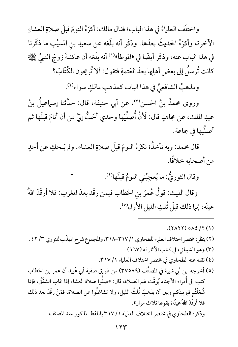 (¬٥) أخرجه ابن أبي شيبة في المصنَّف (٣٧٥٨٩) من طريق صفية أبي عُبيد أن عمر بن الخطاب كتب إلى أُمراء الأجناد يُوقّت لهم الصلاة، قال: "صلُّوا صلاة العشاء إذا غاب الشفَقُ، فإذا شُغلْتُم فما بينكم وبين أن يذهبَ ثُلثُ الليل، ولا تشاغلُوا عن الصلاة، فمَنْ رقَدَ بعد ذلك فلا أرقَدَ اللهُ عينُه؛ يقولها ثلاث مرار".