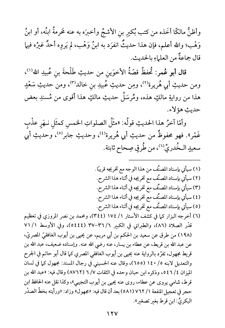 (¬٦) أخرجه البزار كما في كشف الأستار ١/ ١٧٤ (٣٤٤)، ومحمد بن نصر المروزي في تعظيم قدْر الصلاة (٨٦)، والطبراني في الكبير ٦/ ٣٦ - ٣٧ (٥٤٤٤)، وفي الأوسط ١/ ٧١ (١٩٨) من طرق عن سعيد بن الحكم بن أبي مريم، عن يحيى بن أيوب الغافقيّ المصريّ، عن عبد الله بن قريط، عن عطاء بن يسار، عنه رضي الله عنه. وإسناده ضعيف، عبد الله بن قريط مجهول، تفرّد بالرواية عنه يحيى بن أيوب الغافقي المصري كما قال أبو حاتم في الجرح والتعديل لابنه ٥/ ١٤٠ (٦٥٥)، وقال عنه الحسيني في رجال المسند: مجهول كما في لسان الميزان ٤/ ٥٤٦، وذكره ابن حبان وحده في الثقات ٧/ ٦ (٨٧٦٢) وقال فيه: "عبد الله بن قرط، شامي يروى عن عطاء، روى عنه يحيى بن أيوب التجيبي"، وكذا نقل عنه الحافظ ابن حجر في تعجيل المنفعة ١/ ٧٦٢ (٥٨١) بعد أن قال فيه: "مجهول" وزاد: "ورأيته بخطّ الصدْر البكريِّ: ابن قرط بغير تصغير".