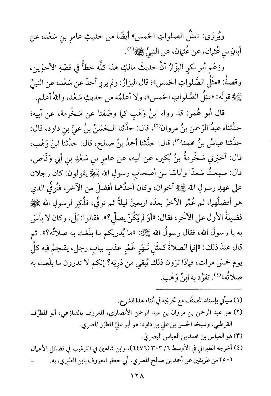 قال أبو عُمر: قد رواه ابنُ وَهْبٍ كما وصَفنا عن مَخْرمة، عن أبيه؛ حدَّثناه عبدُ الرّحمن بنُ مروان (¬٢)، قال: حدَّثنا الحَسَنُ بنُ عليِّ بنِ داود، قال: حدَّثنا عباسُ بنُ محمد (¬٣)، قال: حدَّثنا أحمدُ بنُ صالح، قال: حدَّثنا ابنُ وَهْب، قال: أخبَرني مَخْرمةُ بنُ بُكير، عن أبيه، عن عامرِ بنِ سَعْدِ بنِ أبي وَقّاص، قال: سمِعتُ سَعْدًا وأناسًا من أصحابِ رسولِ الله -صلى الله عليه وسلم- يقولون: كان رجلان على عهدِ رسولِ الله -صلى الله عليه وسلم- أخوان، وكان أحدُهما أفضلَ من الآخر، فتُوفِّي الذي هو أفضلُهما، ثم عُمِّر الآخرُ بعدَه أربعينَ ليلةً ثم توفِّي، فذُكِر لرسولِ الله -صلى الله عليه وسلم- فضيلةُ الأول على الآخَر، فقال: "أوَ لم يَكُنْ يصلِّي؟ ". فقالوا: بَلَى، وكان لا بأسَ به يا رسولَ الله، فقال رسولُ الله -صلى الله عليه وسلم-: "ما يُدريكم ما بلَغت به صلاتُه؟ ". ثم قال عندَ ذلك: "إنما الصلاةُ كمثَلِ نَهَرٍ غَمْرٍ عذبٍ ببابِ رجل، يقتحِمُ فيه كلَّ يوم خمسَ مرات، فماذا ترَون ذلك يُبقي من دَرِنِه؟ إنكم لا تدرون ما بلَغت به صلاتُه" (¬٤). تفرَّد به ابنُ وَهْب.