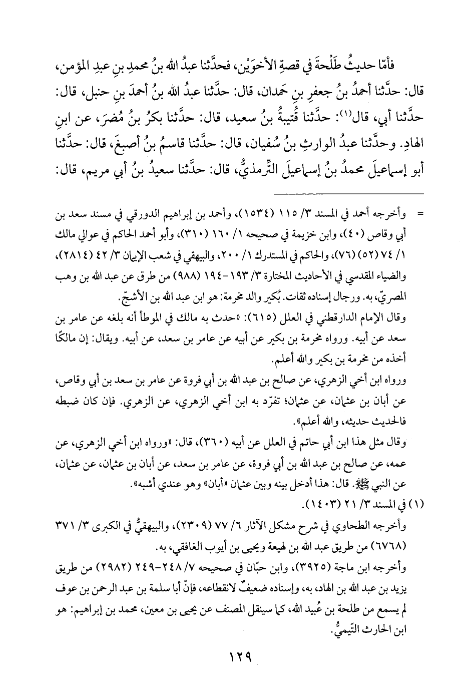 فأمّا حديثُ طَلْحةَ في قصةِ الأخوَيْن، فحدَّثنا عبدُ الله بنُ محمدِ بنِ عبدِ المؤمن، قال: حدَّثنا أحمدُ بنُ جعفرِ بنِ حَمدان، قال: حدَّثنا عبدُ الله بنُ أحمدَ بنِ حنبل، قال: حدَّثنا أبي، قال (¬١): حدَّثنا قُتيبةُ بنُ سعيد، قال: حدَّثنا بكرُ بنُ مُضرَ، عن ابنِ الهادِ. وحدَّثنا عبدُ الوارثِ بنُ سُفيان، قال: حدَّثنا قاسمُ بنُ أصبغَ، قال: حدَّثنا أبو إسماعيلَ محمدُ بنُ إسماعيلَ التِّرمذيُّ، قال: حدَّثنا سعيدُ بنُ أبي مريم، قال: