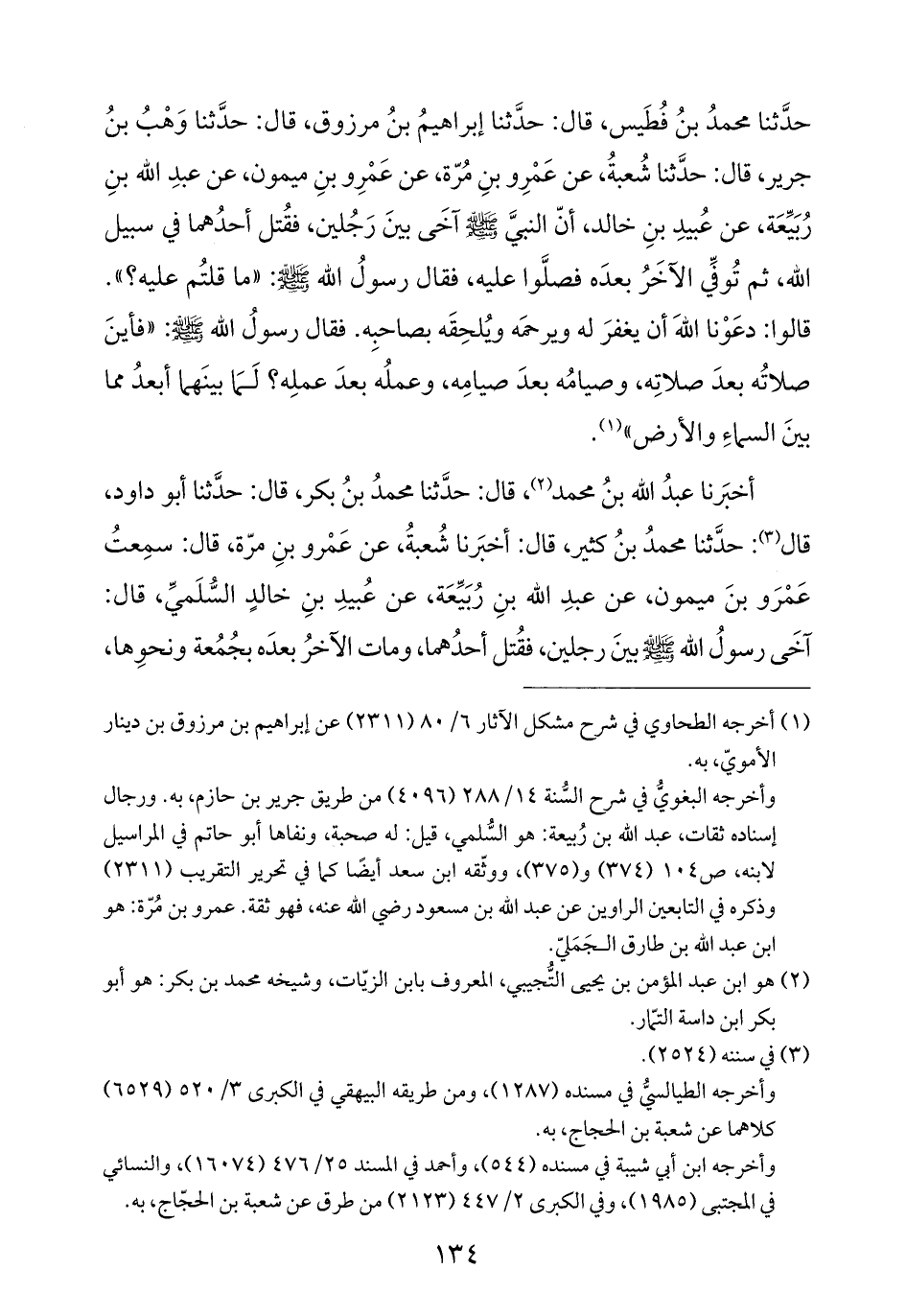حدَّثنا محمدُ بنُ فُطَيس، قال: حدَّثنا إبراهيمُ بنُ مرزوق، قال: حدَّثنا وَهْبُ بنُ جرير، قال: حدَّثنا شُعبةُ، عن عَمْرِو بنِ مُرّة، عن عَمْرِو بنِ ميمون، عن عبدِ الله بنِ رُبَيِّعَة، عن عُبيدِ بنِ خالد، أنّ النبيَّ -صلى الله عليه وسلم- آخَى بينَ رَجُلين، فقُتل أحدُهما في سبيل الله، ثم تُوفِّي الآخَرُ بعدَه فصلَّوا عليه، فقال رسولُ الله -صلى الله عليه وسلم-: "ما قلتُم عليه؟ ". قالوا: دعَوْنا اللهَ أن يغفرَ له ويرحمَه ويُلحِقَه بصاحبِه. فقال رسولُ الله -صلى الله عليه وسلم-: "فأينَ صلاتُه بعدَ صلاتِه، وصيامُه بعدَ صيامِه، وعملُه بعدَ عملِه؟ لَمَا بينَهما أبعدُ مما بينَ السماءِ والأرض" (¬١).